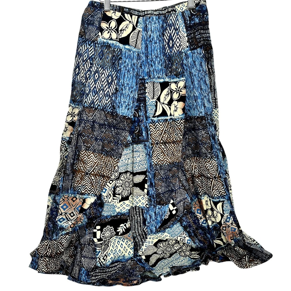 Chico's Maxi Skirt Womens Medium Blue Patchwork Floral Lined Boho Coastal ZIP + BUTTON CLOSE. Very good condition, see all pictures for views. SIZE TAG WAS REMOVED, SEE MEASUREMENTS TO ENSURE BEST FIT. •Waist: 28-30" Little stretch •Length: 35" Thank you for your purchase, we appreciate you!