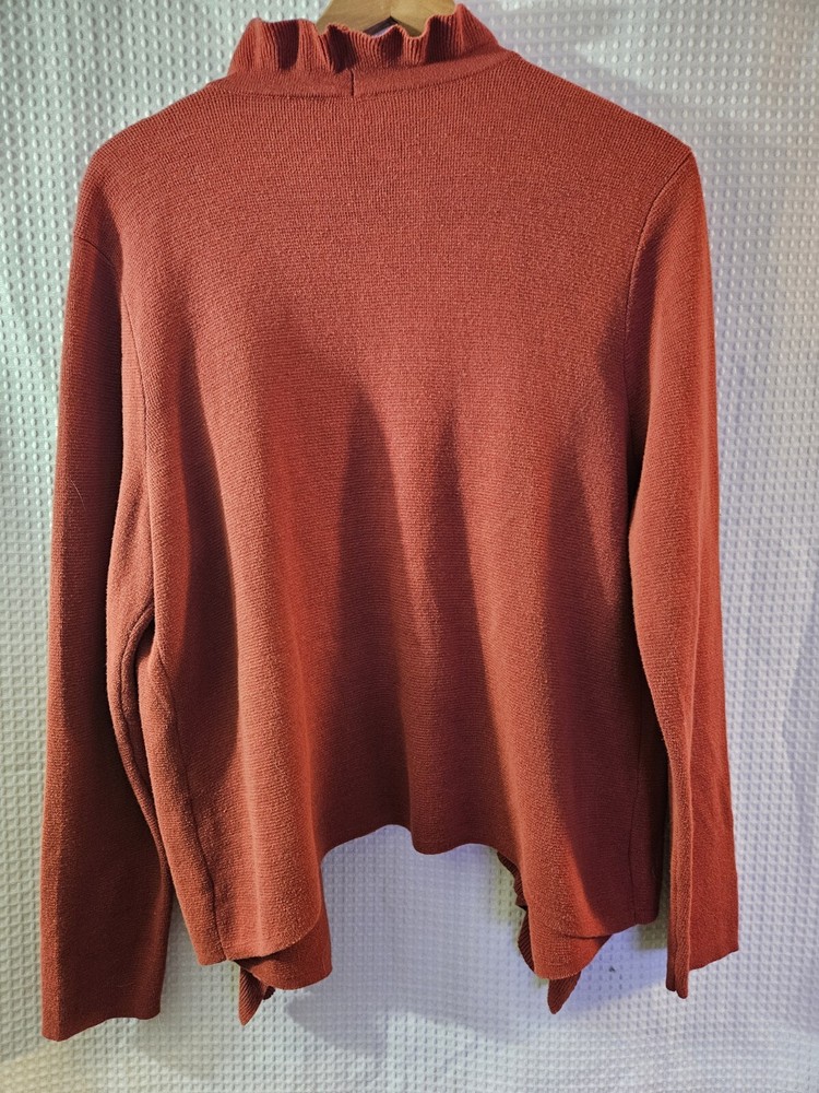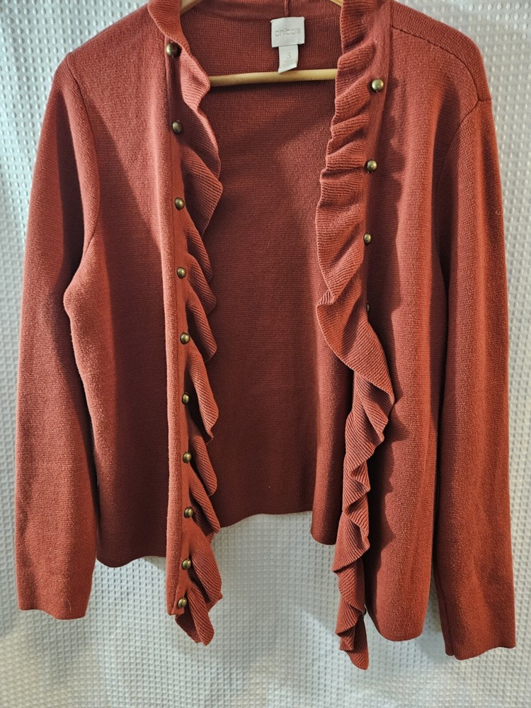 Add a touch of elegance to your wardrobe with this beautiful Chico's sweater. The red metal 'studs' line the length of the cardigan, replacing traditional buttons. The plus size 3X sweater is perfect for any woman looking for a comfortable yet stylish addition to their collection. The sweater is made with high-quality materials and features a lined interior for added comfort. Its stylish design and unique accents make it perfect for any occasion. Don't miss out on the chance to add this stunning Chico's sweater to your wardrobe today.