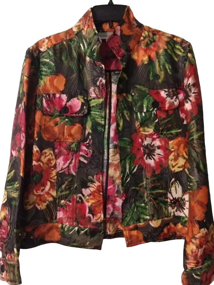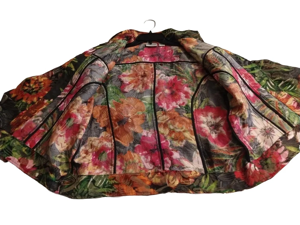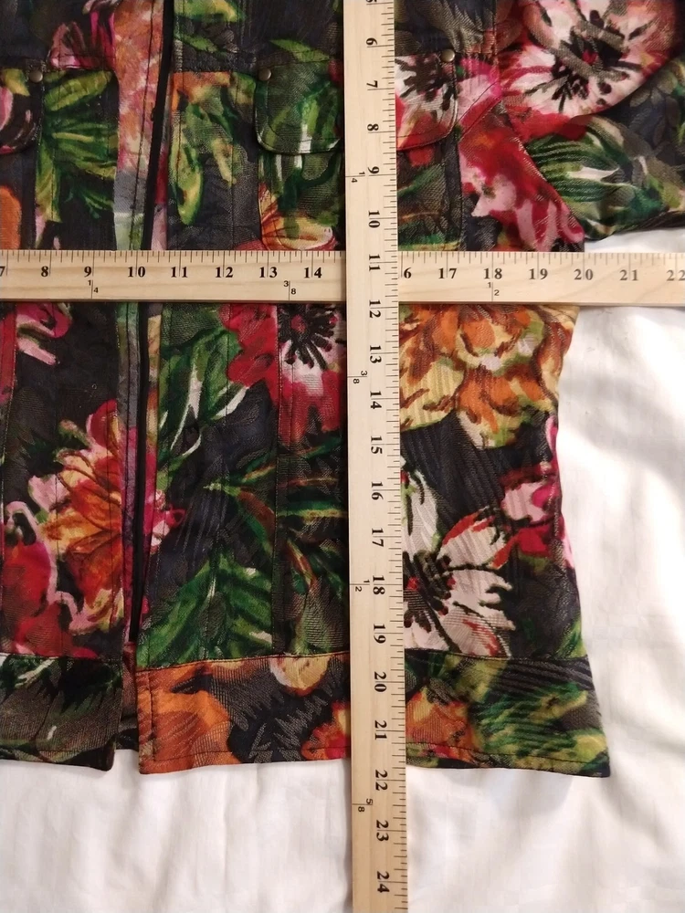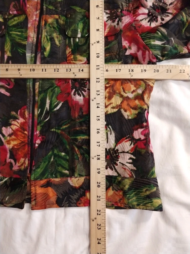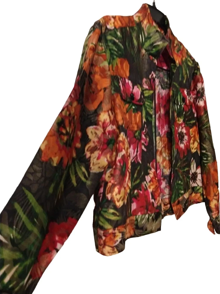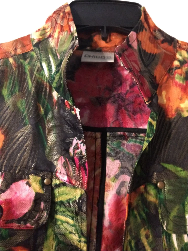 Chicos Cropped Jacket Silk/Rayon Blend Tapestry Open Front Tropical Floral. Chicos Size 1 So unique, rich, saturated color. Excellent pre-owned condition! If you're headed to a tropical location... this is a must have lightweight, statement jacket 🌸🏵️🌴 No front closure. Button cuff sleeves. Great quality and style! Please see measurements in photos!! Please inspect photos thoroughly. Thank you 🌼 W154B4