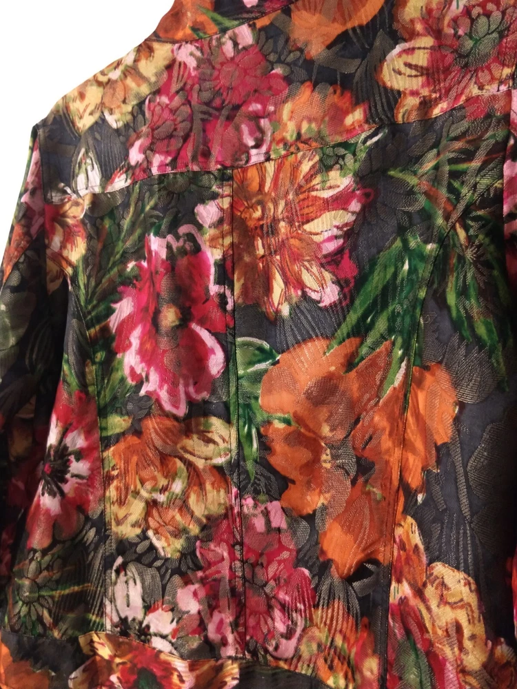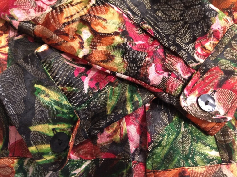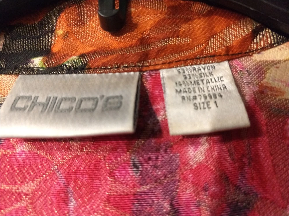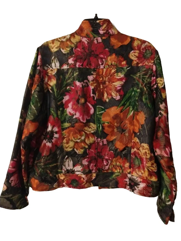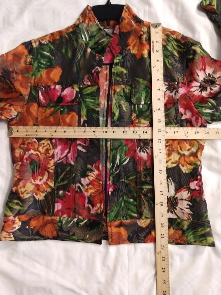 Chicos Cropped Jacket Silk/Rayon Blend Tapestry Open Front Tropical Floral. Chicos Size 1 So unique, rich, saturated color. Excellent pre-owned condition! If you're headed to a tropical location... this is a must have lightweight, statement jacket 🌸🏵️🌴 No front closure. Button cuff sleeves. Great quality and style! Please see measurements in photos!! Please inspect photos thoroughly. Thank you 🌼 W154B4