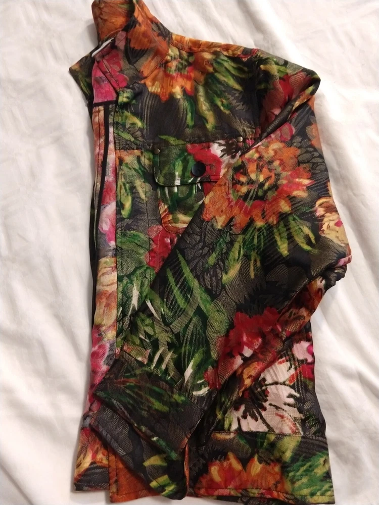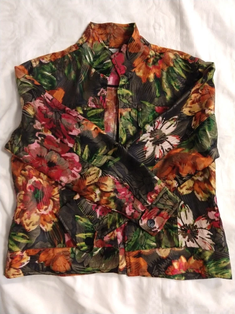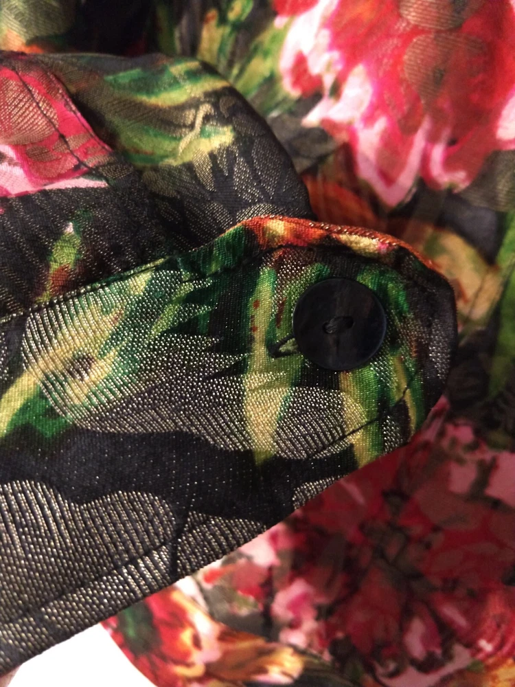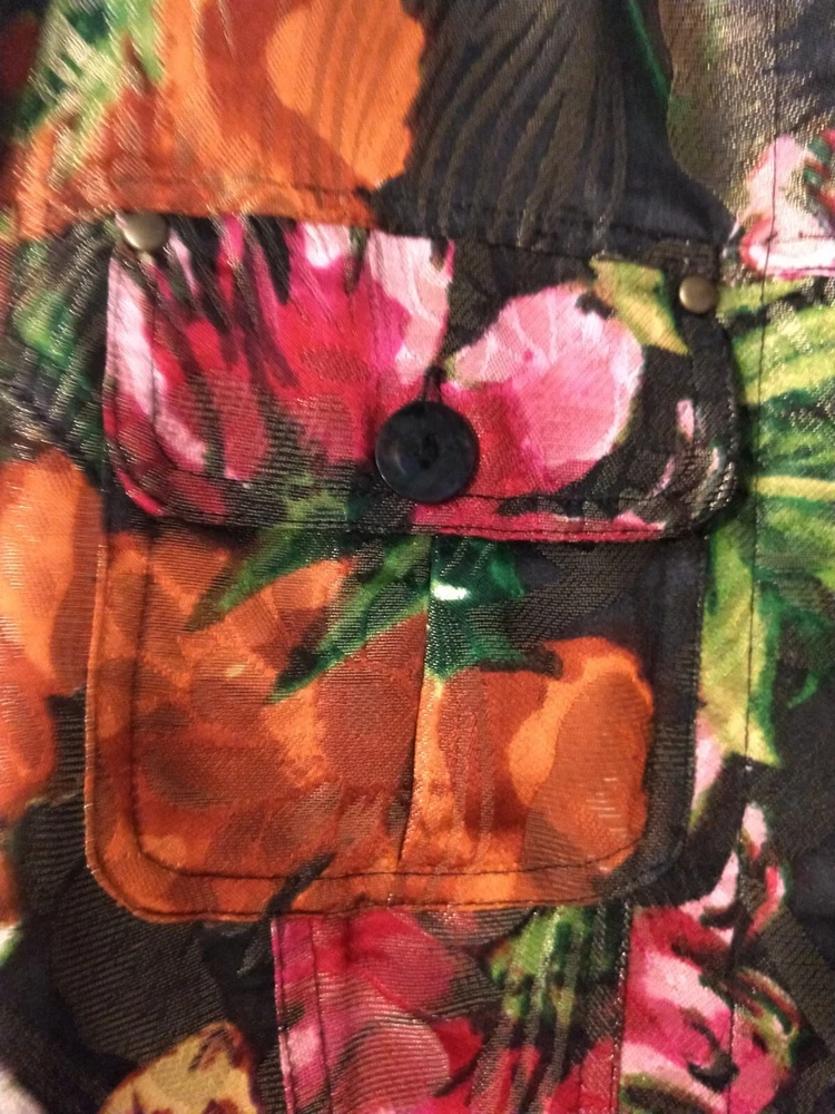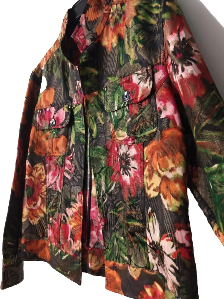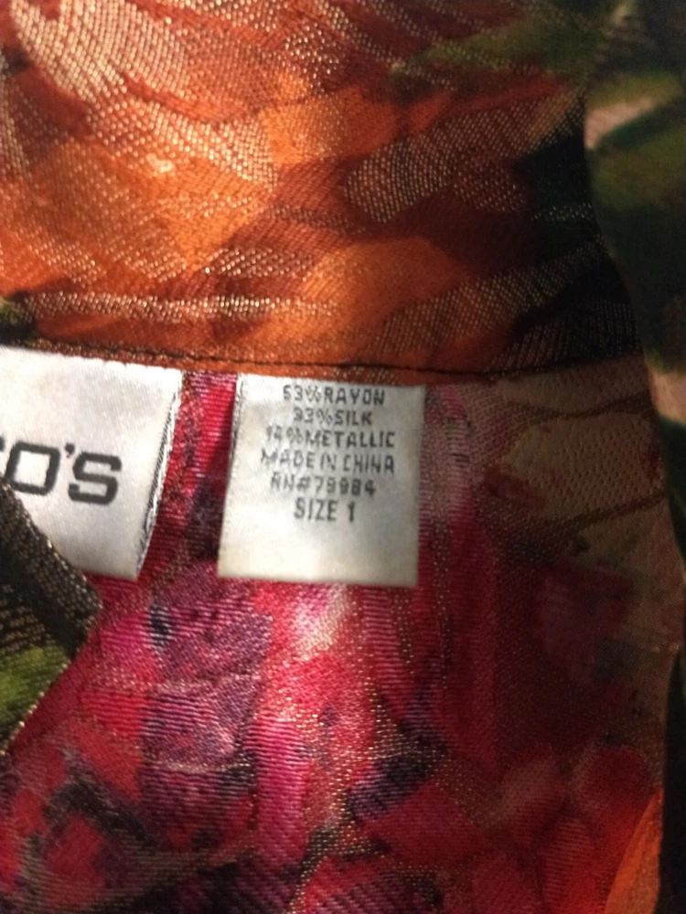 Chicos Cropped Jacket Silk/Rayon Blend Tapestry Open Front Tropical Floral. Chicos Size 1 So unique, rich, saturated color. Excellent pre-owned condition! If you're headed to a tropical location... this is a must have lightweight, statement jacket 🌸🏵️🌴 No front closure. Button cuff sleeves. Great quality and style! Please see measurements in photos!! Please inspect photos thoroughly. Thank you 🌼 W154B4