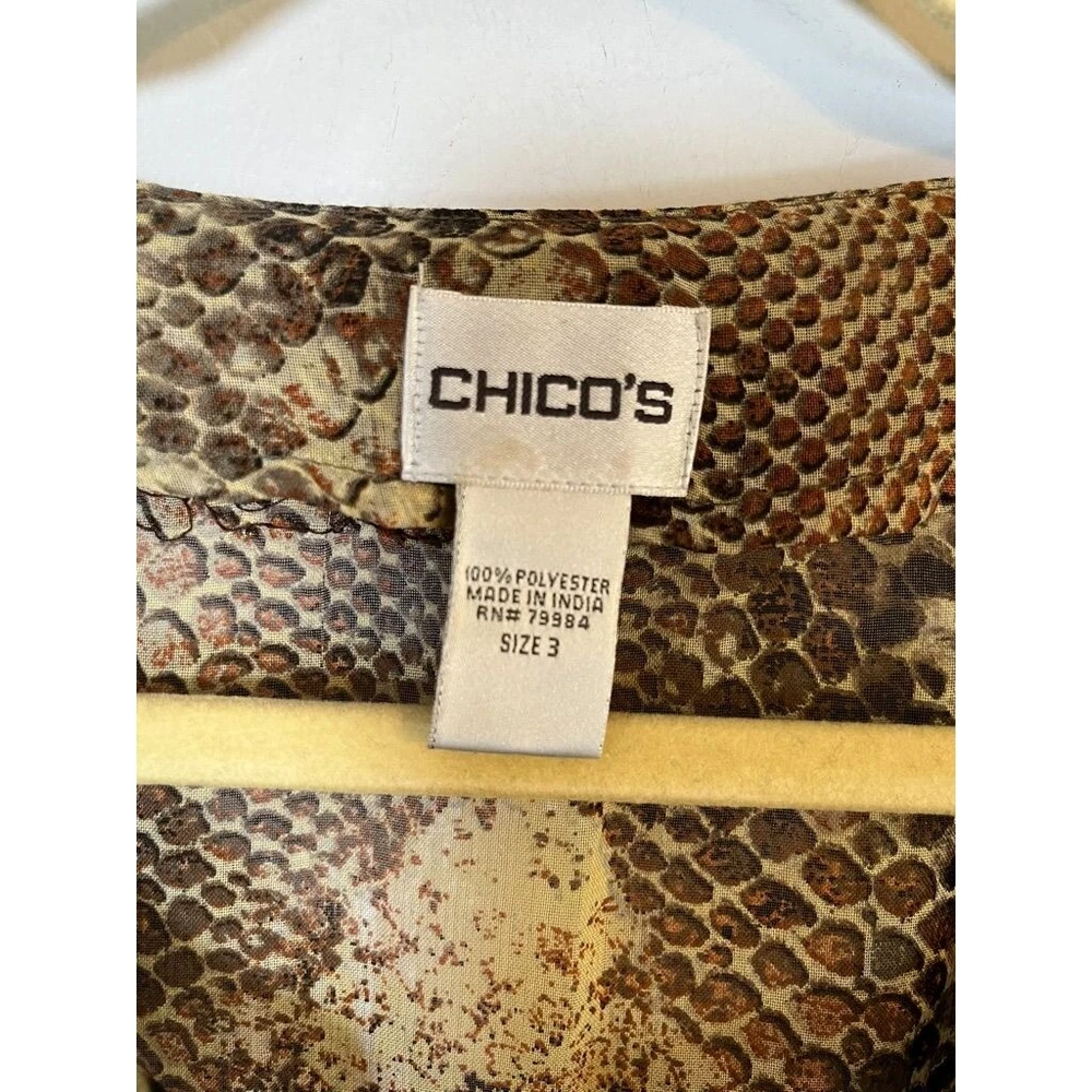 Fit: Regular Size Type: Regular Department: Women Season: Fall, Spring, Summer Sleeve Type: Casual Sleeve Theme: Animals Color: Multicolor Sleeve Length: 3/4 Sleeve Country/Region of Manufacture: Unknown Material: Polyester Brand: Chico's Character: Animal Print Accents: Sequin Personalize: No Closure: Pullover Occasion: Business, Casual, Travel, Workwear Neckline: V-Neck Pattern: Animal Print Handmade: No Strap Type: NA Features: Lightweight, Stretch Size: XL Vintage: No Fabric Type: Knit MPN: N Garment Care: Machine Washable Style: Basic Seller Notes: “Good” Type: Blouse