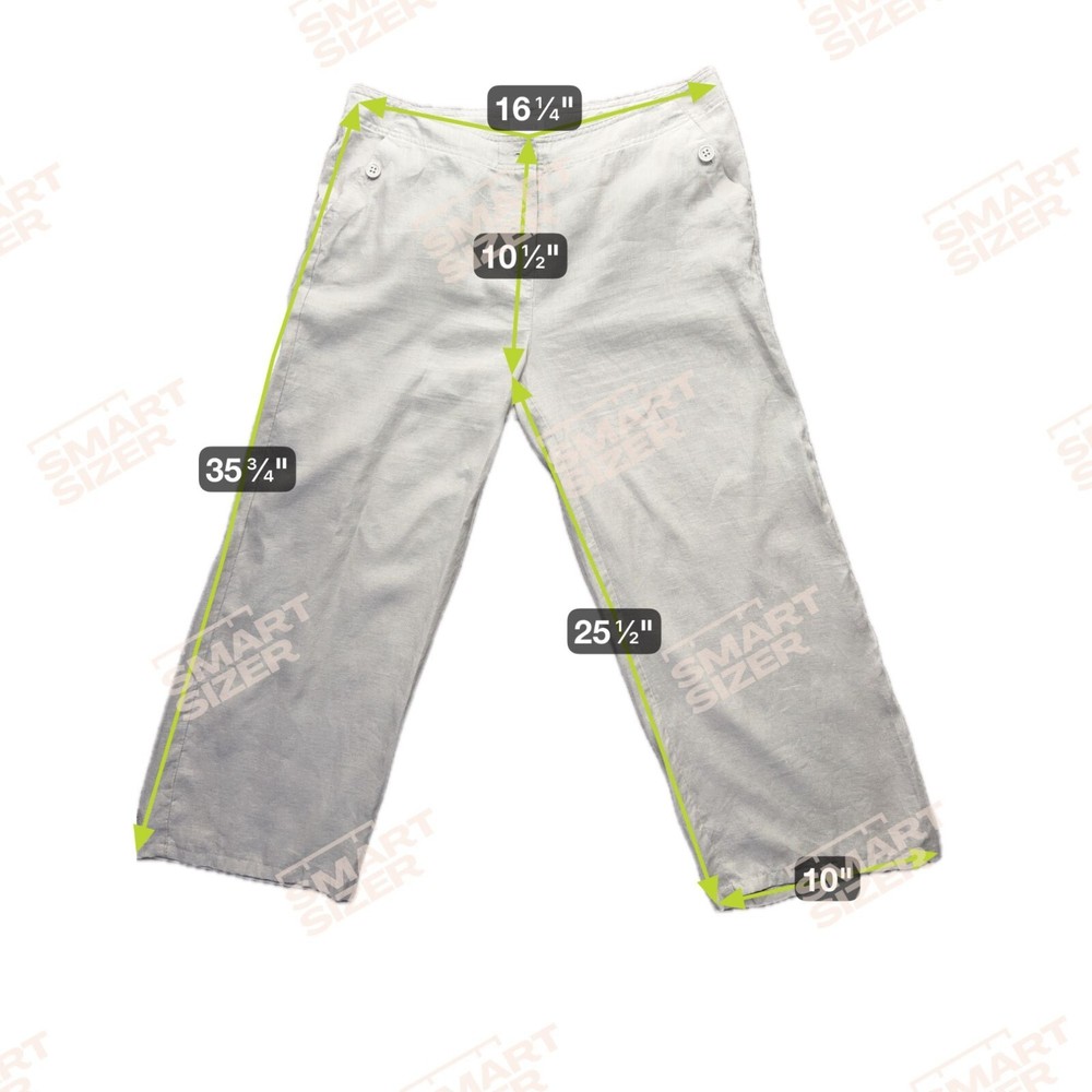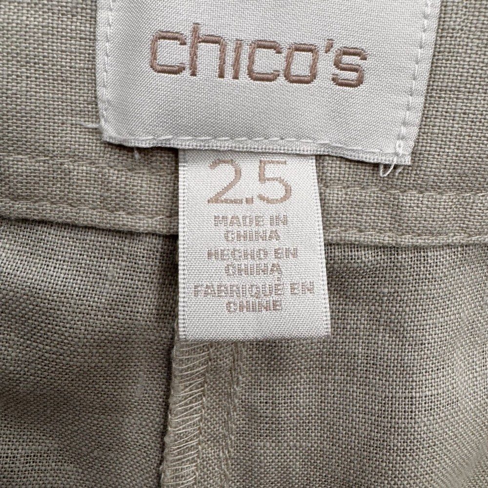 In the quiet corners of a summer garden, these linen pants find their essence. Crafted by Chico's, they whisper tales of comfort and style. With a gentle beige hue, they promise airy elegance, keeping you cool under the sun's embrace. Their wide-leg design invites freedom, perfect for leisurely strolls. • Wide leg design • Button detail on waistband • Two side pockets • Breathable linen material • Made in China Top to bottom = 35.75 inches Waist = 16.5 inches