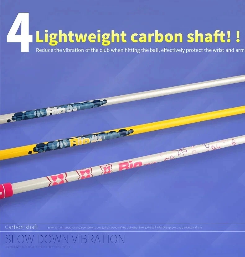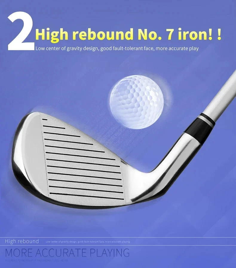 1. Large-volume alloy driver with wide hitting surface, higher hit rate and easy control of ball distance . 2. High rebound No. 7 iron! Low center of gravity design, good fault-tolerant face, more accurate play . 3. High hit rate putt, aiming line to the center of the ball, standard inclination, simple control . 4. Ultra-light carbon shaft reduces the vibration of the club when hitting the ball, effectively protecting the wrist and arm.