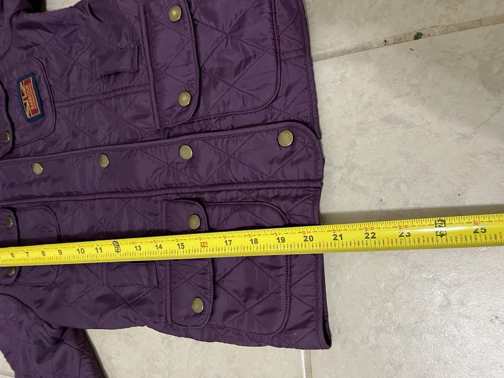 Wrap your little one up in style with this gorgeous Barbour quilted coat, perfect for fall and winter. The coat features a full zip closure and an adjustable strap for a comfortable fit. The purple and burgundy colors are perfect for a pop of color in a sea of grey. Crafted from 100% polyester, this coat is durable and will keep your child warm all season long. The coat is perfect for outdoor activities, whether it's a day at the park or a hike in the woods. The coat is available in size small, perfect for girls size 6/7.