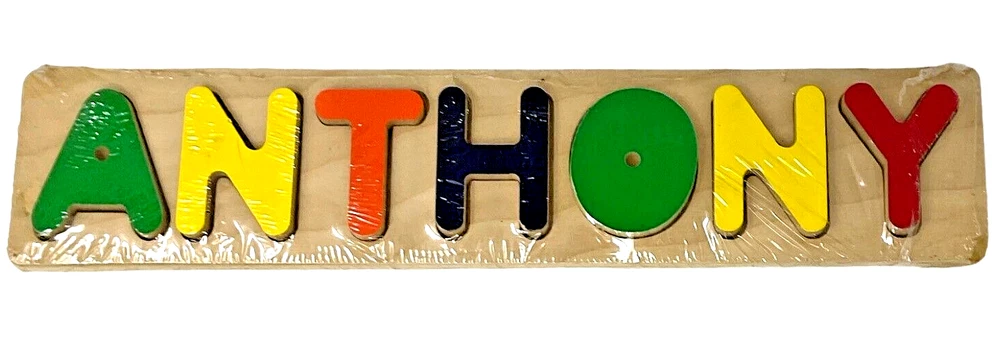 Children's Wooden Cut Out Letters Name Puzzle "ANTHONY" - 16" x 4". *NOTE: Puzzle is Still in Shrink Wrap Never Used, However, Bottom Right Corner Shrink Wrap Peeled Back Damage to Corner (See Picture).