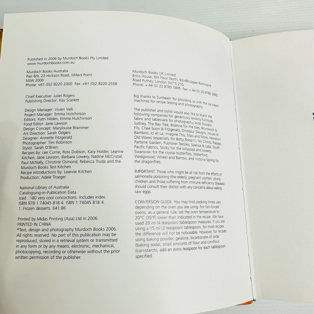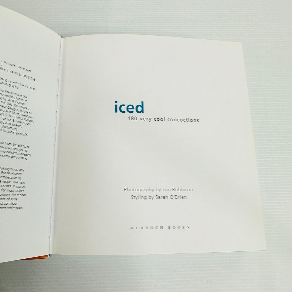 Book Title: Iced: 180 Very Cool Concoctions Author: Murdoch Books Seller Notes: “Pre-owned, see photos for condition and read the description.” Item Height: 200mm Format: Paperback Number of Pages: 416 Pages Narrative Type: Non-Fiction Topic: Cooking, Cooking by Ingredient, Desserts Language: English Item Width: 185mm Publisher: Murdoch Books Genre: Cookbooks