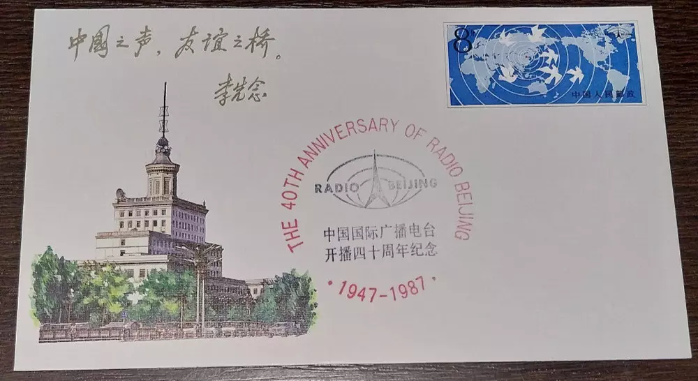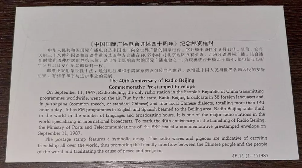 China 1987 Postal stationery envelope with red cancel `` Radio Beijing``. AI description! This China 1987 postal stationery envelope features a red cancel mark commemorating the Radio Beijing. The envelope is in VF (Very Fine) grade and has no gum. It was issued between 1981-1990 and bears the image of the Radio Beijing logo. This collectible item is perfect for stamp enthusiasts and those interested in Chinese history.