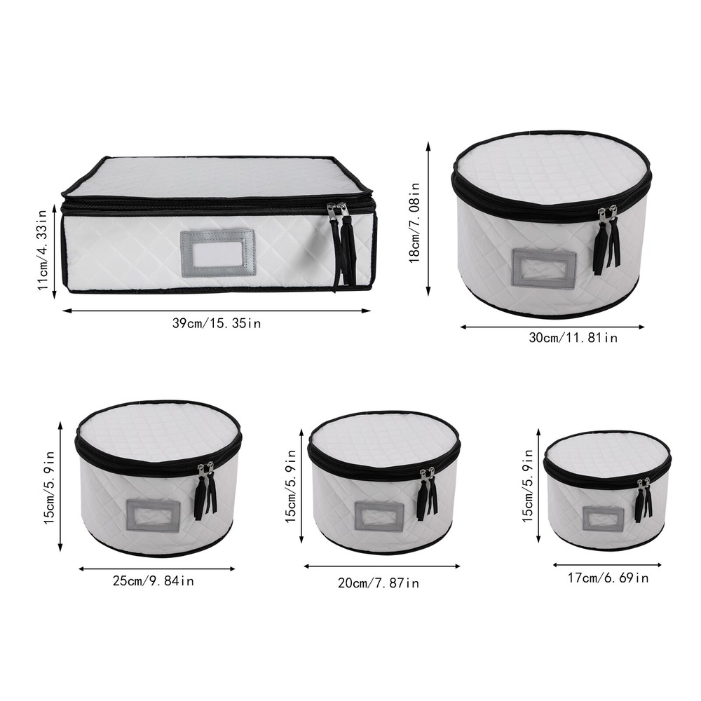 China Storage Containers with Lid , Dinnerware Storage Box for Dishes & Plates Description Are your dishes, cups, and saucers always misplaced, taking up space, or breaking by accident? You need to get yourself this dinnerware storage organizer set. It includes five organizers made of soft and elastic material and boasts a large capacity for storing and protecting your plates and cups from scratch and cracking, helping you manage your dishes effectively, and making your table and kitchen more tidy. Whether you are a housewife or a professional cooker, it is a good and indispensable helper for you. Key Features π₯ High-quality Material: It is mainly made of high-quality polyester, sponge, and paperboard with excellent wear resistance and durability, making our products the ideal protector and organizer for your plates. π₯ Kitchen Organizer: This set includes five different sizes of organizers for storing and organizing plates, cups, saucers, and other kitchenware, saving you kitchen space and meeting your daily categorized storage needs. π₯ Tableware Protector: With a soft sponge inside and polyester outside, it can protect your fragile plates, dishes, and cutlery from scratches or cracks, ensuring they remain clean, dust-free , and intact to a certain extent. π₯ Large Capacity: The four round organizers with different sizes can accommodate saucer plates, dessert plates, salad plates, dinner plates, etc., while the large rectangular one with 12 compartments can store your cups safely and orderly. Additionally, the removable partitions bring you more convenience for storing the large size of mugs. β¨ Easy to Store & Carry: They are stackable and lightweight, so you can easily move them or store them in your cabinets and pantry closet. β¨ Double-zipper Design: It not only makes it easier to open and close but also provides a good seal to keep out dust, moisture, and dirt. β¨ Ideal Gift: The convenient and practical design makes it a great housewarming, bridal, holiday, Christmas, Halloween, and New Year gift. β Customer Service: We aim to provide quality products and services. If you have any problems, please feel free to contact us. We will reply and solve the problem for you as soon as possible. Details Label Holder: You can insert your own label into the label holder of each organizer to categorize your items, helping quickly identify contents inside and allowing for easier access. Plate Mats: Soft felt fabric plate mats can separate the plates when stored in the organizer, preventing them from bumping into each other and causing accidental breakage or loss. Application It can be used to organize different types and sizes of plates in the kitchen, and easily store dinner plates, salad plates, and bowls as well as crystal glasses, goblets, champagne, wine glasses, mugs, tumblers, and coffee cups. Notes Please check the size carefully before ordering. Product capacity is for reference only and will also depend on the height of the plate. Please allow the slight color difference caused by the shooting light and 1-3cm error due to manual measurement, and make sure you do not mind before you order. Specifications Color: Creamy White Style: Modern Shape: Round, Rectangular Material: Polyester, Sponge, Felt Fabric, Paperboard Assembly Required: No Closure Type: Zipper Number of Items: 5 Number of Compartments of the Large Organizer: 5 Four Round Organizer Size(D*H): 30*18cm/11.81*7.08inch,25*15cm/9.84*5.9inch, 20*15cm/7.87*5.9inch,, 17*15cm/6.69*5.9inch Large Rectangular Organizer(L*H): 39*11cm/15.35*4.33inch Packaging Size: 33.5*13*38cm/13.19*5.12*14.96inch Gross Weight: 2kg/4.41lbs Package Included 5* Dinnerware Storage Organizers 4Set* Plate Mats Payment Delivery details Terms of sales About us Contact us Payment We accept ebay payment γ Fees such as import duties, taxes are not included in the item price or shipping costs. These charges are the buyer's responsibility. Delivery details Shipping: 2-9 working days to: USA Terms of sales We maintain high standards of excellence and strive for hundred percent customer satisfaction. Feedback is very important to us. We hope that you contact us immediately before you give neutral or negative feedback, so that we can address your concerns. It is impossible to address issues if we do not know about them! About us Your satis faction is our ultimate goal. We work hard to earn your trust and future business. Our certified technicians have tested each item before shipping. The unit comes with 1 year limited warranty on all manufacturing defects. a) If you receive a defective item, you may return it or ask for a discount. Please contact us within 14 days after you receive the package. b) What you returned must be intact and in its original packaging as re? u. Customer is responsible for shipping costs of the returned item. c) We will cover the cost of shipping back t with the shipping rate indicated in the registration page. We will send you a new unit or refund the full payment you paid. Thank you. Contact us Business Hour Business Hour: Monday To Friday: 8:30 AM to 5:00 PM (Beijing China time) Due to time zones, our reply to your questions may not be immediately. But within above working time, we will reply your email within 24 hours. If it's non-workdays, please kindly be patient and wait till Monday. Please contact us with ebay message. Please feel free to contact us if you have any questions. Monday To Friday: 8:30 AM to 5:00 PM (Beijing China time) Due to time zones, our reply to your questions may not be immediately. But within above working time, we will reply your email within 24 hours. If it's non-workdays, please kindly be patient and wait till Monday. Please contact us with ebay message. Please feel free to contact us if you have any questions.