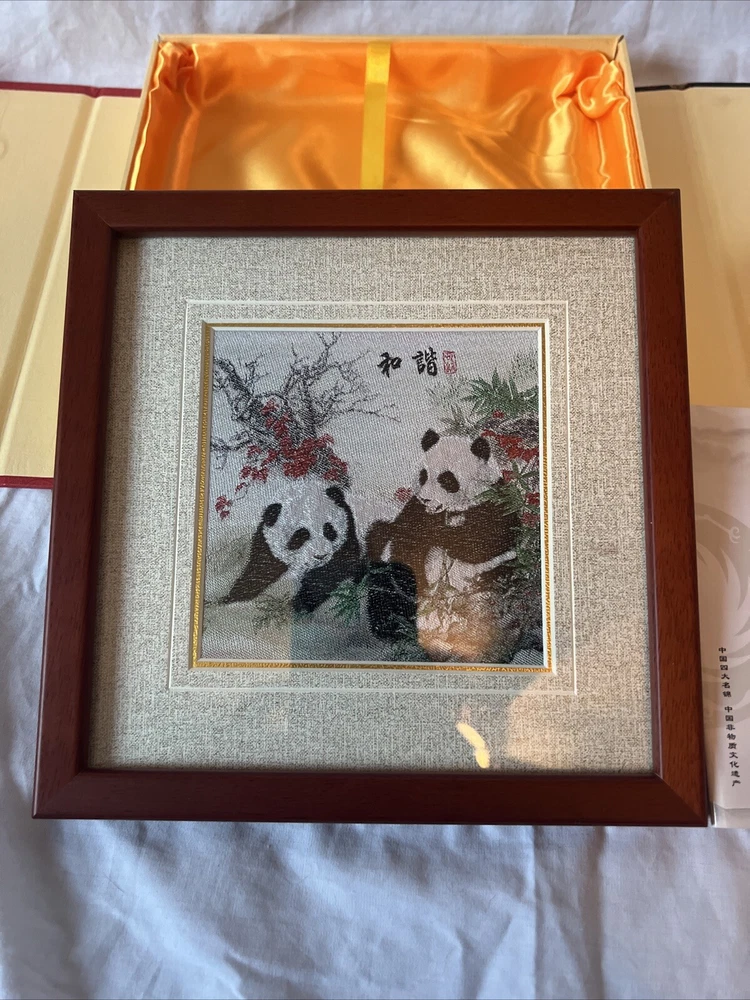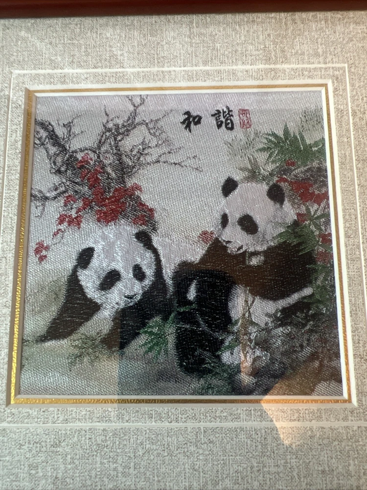This beautiful framed artwork is a vintage original from China. The intricate details on the bamboo silk embroidery of a Chinese panda make it a unique piece of art. The multi-color palette adds a touch of elegance to the piece, making it a great addition to any antique collection. The age of the artwork is unknown, but it is sure to be a conversation starter in any room. This artwork is perfect for those who appreciate Asian antiques and art. Measures 8 1/4” x 8 1/4” and half half an inch thick.