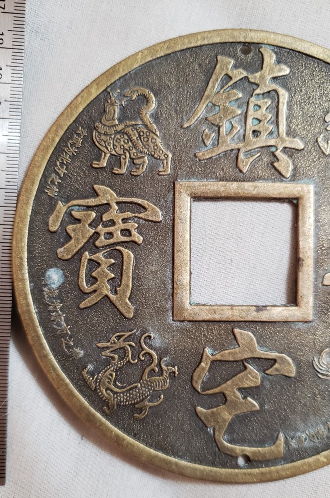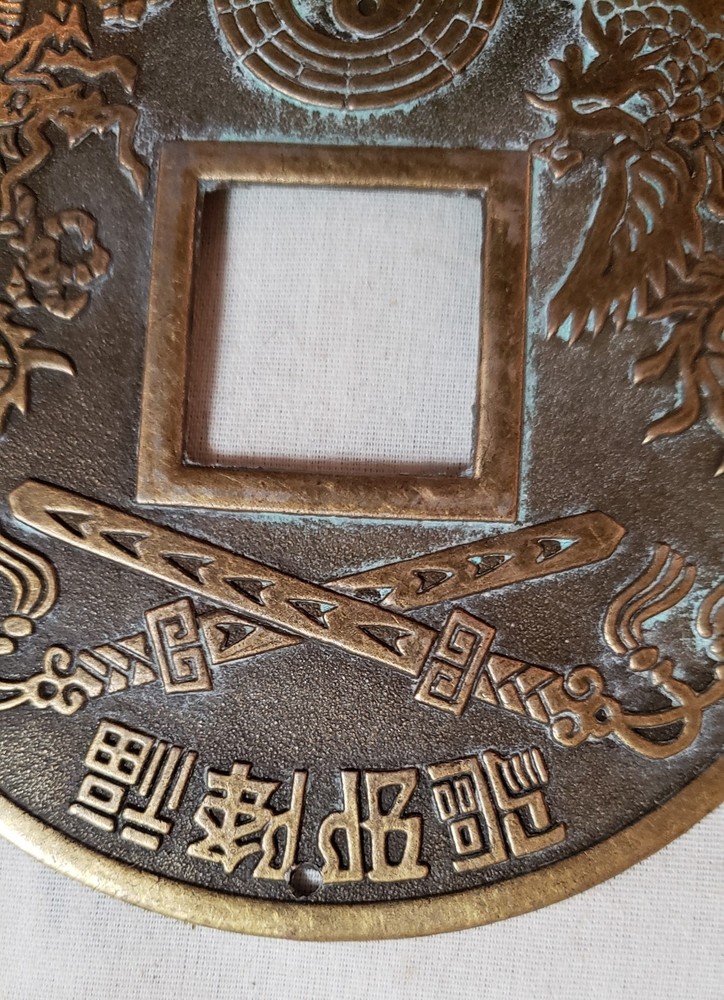 This Chinese Feng Shui Charm Coin is a 5" diameter brass/bronze talisman featuring a dragon, phoenix and yin-yang symbols, representing good fortune in Chinese culture. The charm is believed to bring positive energy and prosperity to its surroundings, making it a popular collectible item among those interested in Asian cultures and ethnicities. This talisman is a beautiful and meaningful piece that can be used for Feng Shui purposes or as a decorative item to add a touch of Chinese charm to any space.