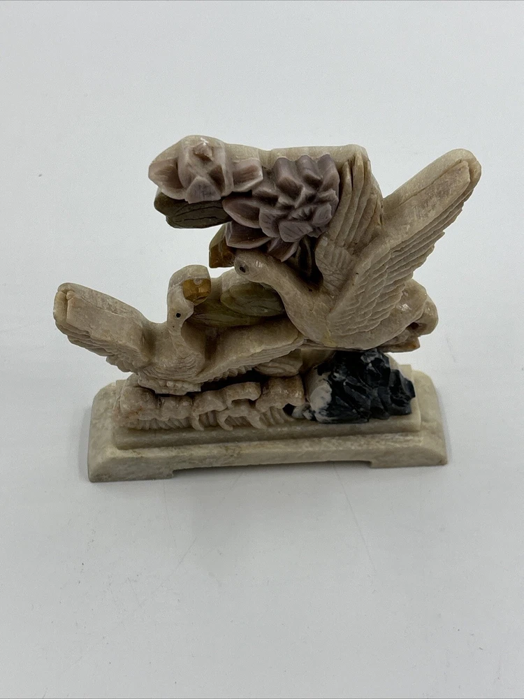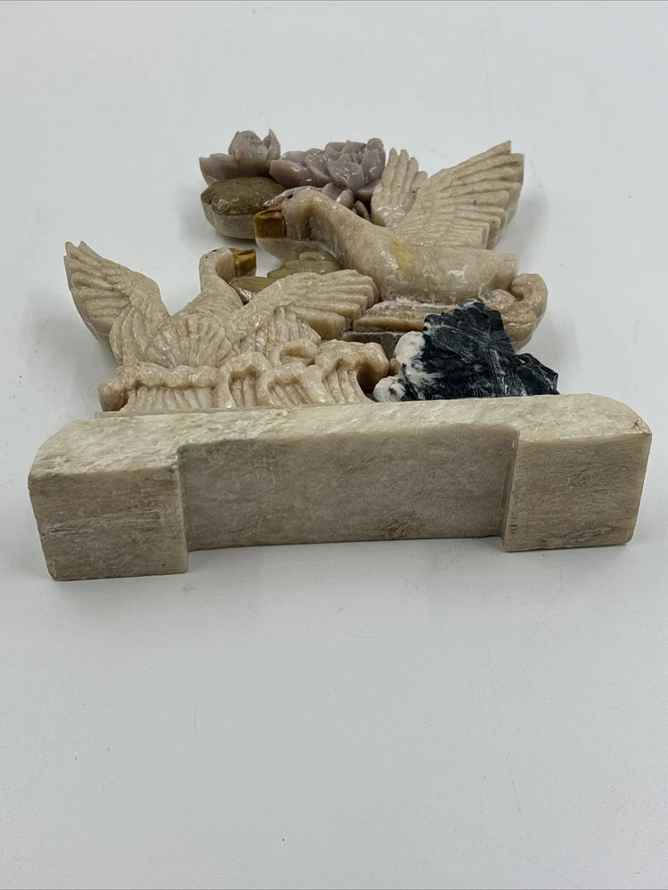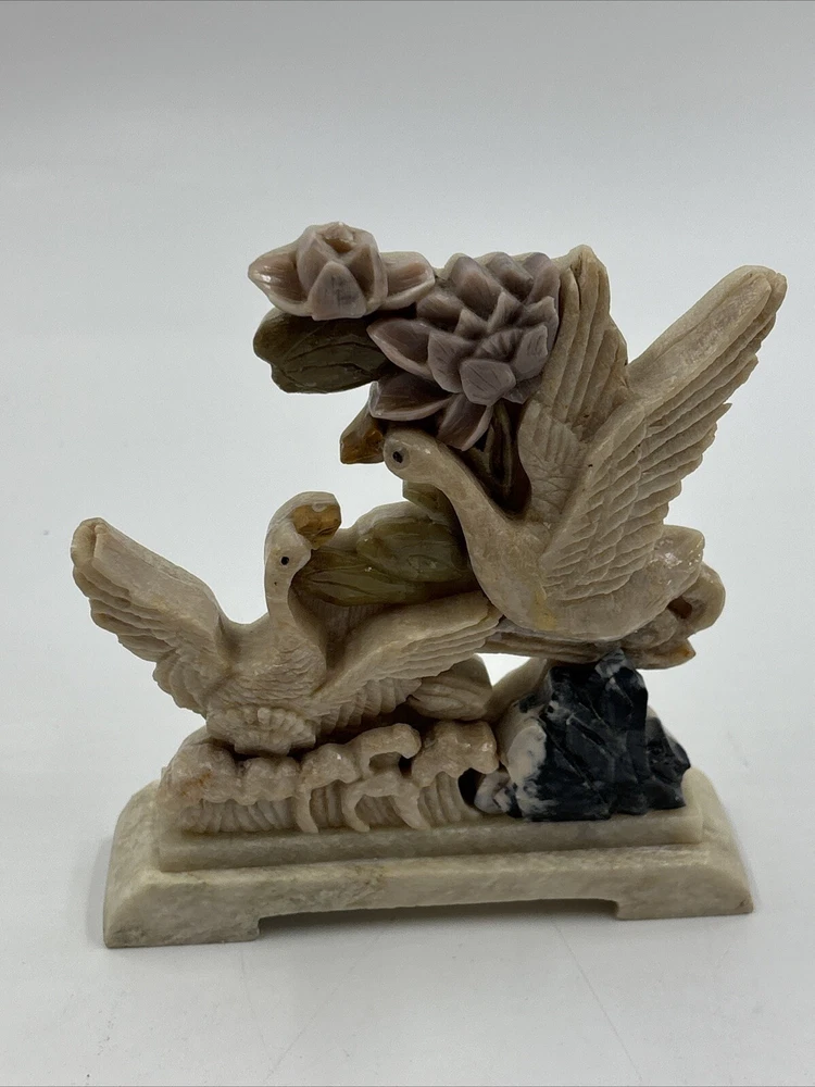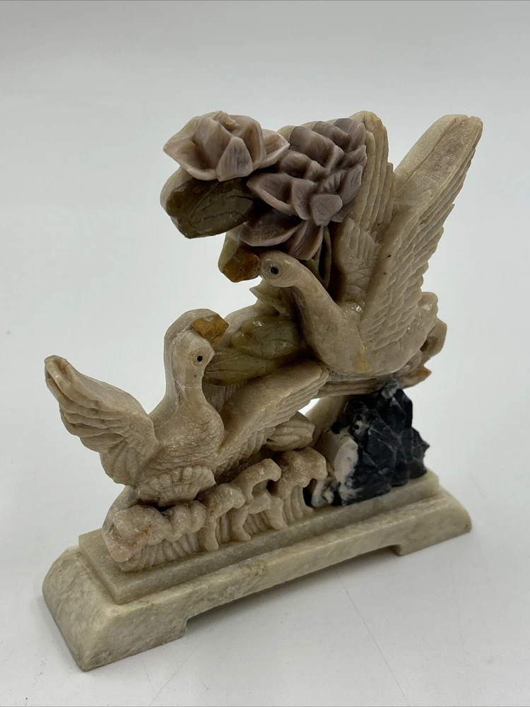 Chinese Multi Hardstone Duck Carving Sculpture. Depicts 2 ducks among floral motifs on a rectangular carved stone pedestal base. Measures about 6 in tall and 1 in wide and weighs about 1 lbs. It is in good condition, with no significant signs of wear. See pictures.