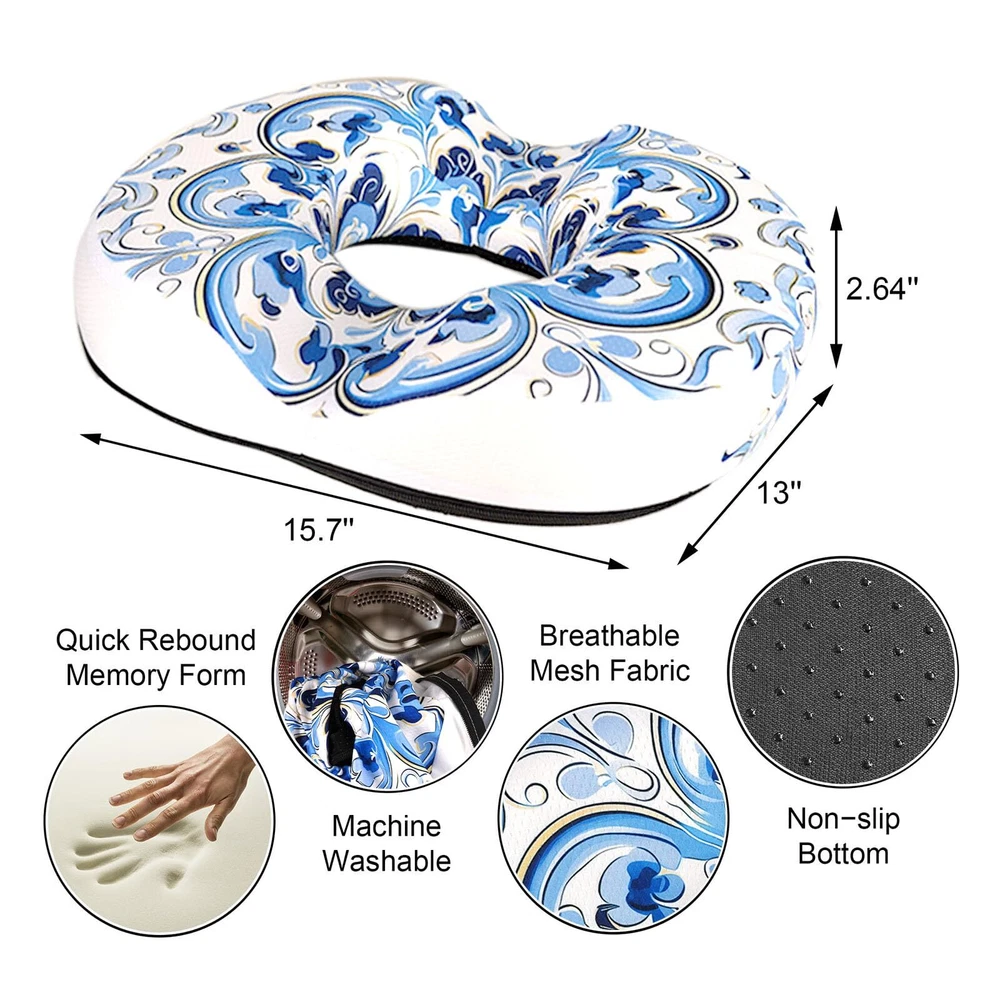 Chinoiserie Flowers Donut Pillow for Hemorrhoids Seat Cushion for Tailbone Pain Relief - Chinoiserie Decor Home Office Chair Cushion for Long Sitting Work - Memory Foam Car Seat Cushions for Driving Butt Pain Pressure Relief Chinoiserie Flowers Seat Cushion for Tailbone Pain Relief: When you have a work long sitting, sedentary discomfort is a real issue, long sitting can lead to a variety of health problems, including tailbone pain, driving butt pain, lower back pain, tailbone pressure. Our Chinoiserie Flowers office chair cushion design distributes weight evenly, provides back support for chair, provides tailbone pressure relief and pain relief. Chinoiserie Flowers Hemorrhoid Pillow for Pressure Relief: For person suffering from hemorrhoids, the pain and discomfort can make sitting for extended periods unbearable. Our Chinoiserie Flowers donut pillow for hemorrhoids provides the necessary support and comfort to relieve the pressure on sensitive areas, allowing you to sit without aggravating your hemorrhoids. Ergonomic Design: The Chinoiserie Flowers donut office chair seat cushion shape with ergonomic "U" shaped incisions, use to reduce hip pressure, effectively reduce tailbone pain, thereby reducing hemorrhoid pain, relieve the discomfort caused by long sitting. Tailbone cushions for pressure relief, donut pillow postpartum pregnancy, car seat cushions for driving butt pain, Chinoiserie Flowers donut pillow for tailbone pain. High Quality Seat Cushion: The surface layer of Chinoiserie Flowers donut pillow is made of comfortable and breathable fabric, and the core is high-quality memory foam, which can make you more comfortable and will maintain shape even after many uses, making it a high quality office chair cushion product. Thoughtful Gifts for Birthday: Our Chinoiserie Flowers donut pillow chair cushion is great gifts idea, if you give it as a gift to your family, friends, boss, coworkers, customers and colleagues, they will love it. Chinoiserie Flowers Donut seat cushion is perfect for people with special needs after surgery, pregnant women, elderly, office workers. Donut cushion is perfect for birthday gifts for women, Christmas gifts for mom.