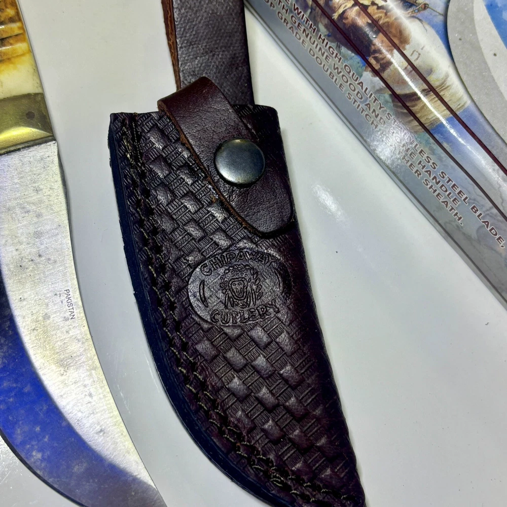 The Chipaway Cutlery Creosote Bush Bowie Knife features a stainless steel blade with a plain edge and a full tang for strength. The handle is made of bone and wood, providing a secure grip. This ambidextrous knife comes with a leather sheath for safe storage and transport. With a blade length between 4.1 to 5 inches, this collectible fixed blade knife is both functional and visually appealing.