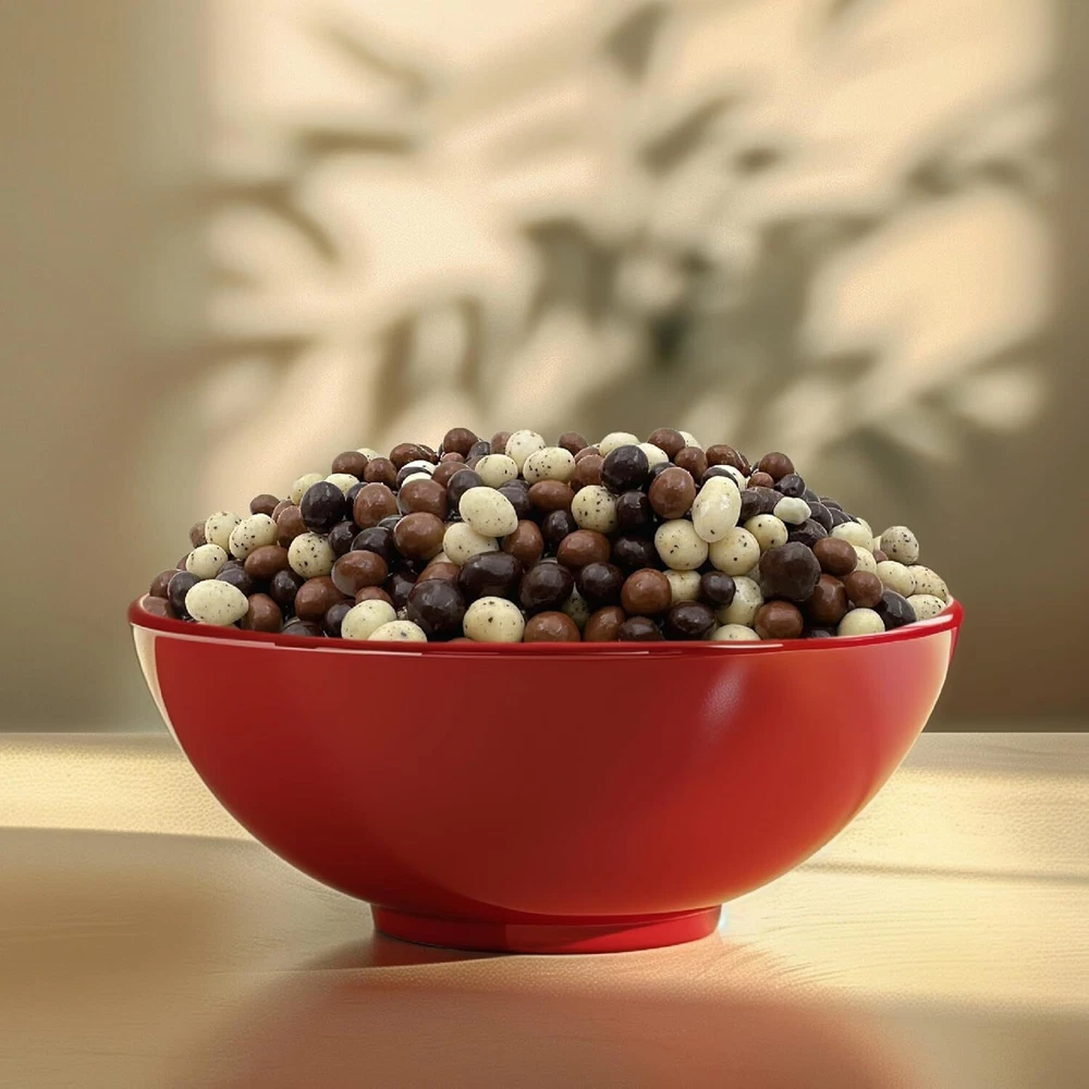 This bulk bag holds 2 pounds of Chocolate Covered Tri-Colored Espresso Coffee Beans Savor the perfect combination of dark, milk, and white chocolate espresso beans that will give you a boost of energy Bold espresso beans provide an authentic coffee experience with every bite, enhanced by the smooth sweetness of chocolate Enjoy a handful of these chocolate-covered espresso beans for a delicious and energizing treat, perfect for a mid-day pick-me-up Use them as a topping for cakes, cookies, or ice cream, adding a rich coffee flavor and a touch of class to your desserts