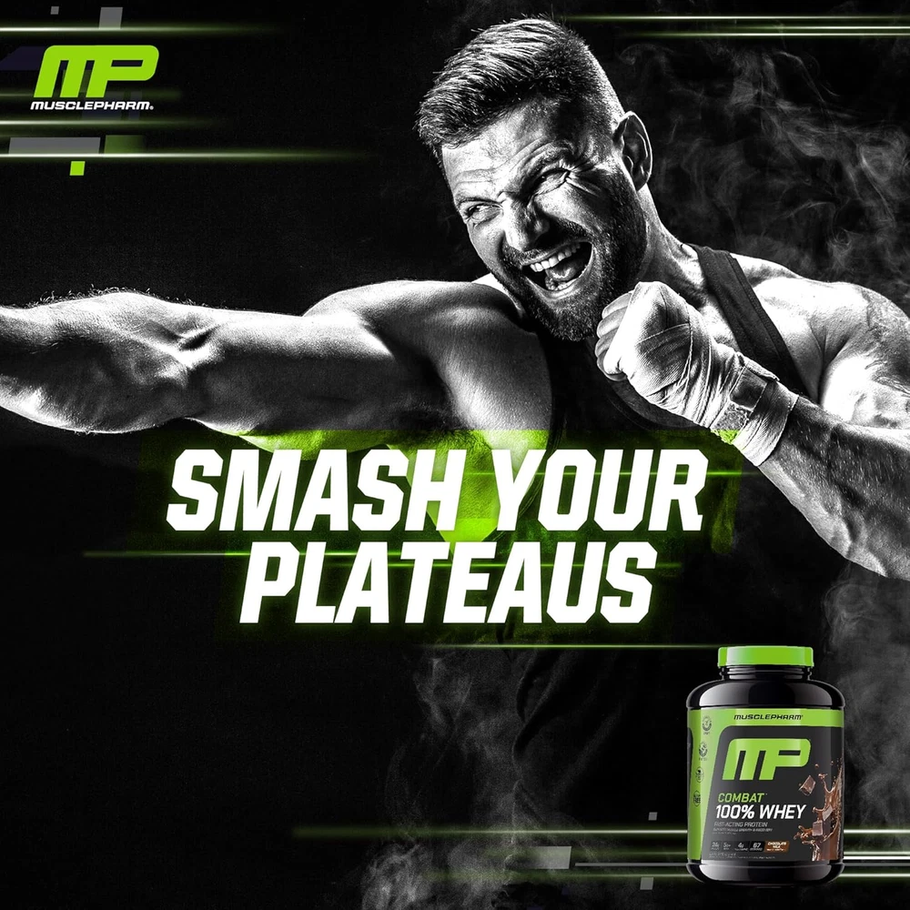 Peak Muscle Recovery & Gain: MusclePharm Combat 100% Whey is the go-to protein powder for those who demand excellence. Each serving offers 24g of protein from and premium whey protein isolate & and concentrate. Fast Digesting Protein Powder for Enhanced Athletic Performance: Engineered for maximum protein concentration and minimal carbs, whey protein isolate powder digests and absorbs rapidly. Whey protein concentrate contains real subtractions and is digested similar to the way whole food would be. Tastes Great & Mixes Easily: 70 servings of mouthwatering Chocolate Milk flavor, tastes great so you'll enjoy this protein boost. Shake & and take pre or post-workout to achieve your fitness goals faster and more efficiently. Crafted by Experts, Delivered with Excellence: MusclePharm Combat 100% Whey is dye-free, gluten-free, banned substance tested and certified by Informed-Choice and Informed-Protein, so athletes can take it with confidence. Unleash Your Potential: Our mission is to fuel the relentless pursuit of greatness among athletes. Our cutting-edge, science-backed formulas optimize physical performance, enhance recovery, and ensure you have the tools you need to conquer new heights and redefine your limits. Product Description Performance & Recovery Build, Boost & Recover Combat 100% Whey protein is optimized to benefit overall nutrition, muscle growth and recovery. Ultra-Premium 100% Whey 24g Protein Per Serving Includes high quality sourced pure whey protein isolate & concentrate. Banned substance tested. Optimized for Results Fast-Digesting Isolate Combat Whey powder delivers an immediate energy boost as well as sustained muscular support. Easy Delivery Scoop, Shake & Enjoy Day or Night Mix 1 scoop Combat Whey Protein Powder with 8-12 fl. oz. of cold water and shake. Consume any time. 1 PRODUCT BENEFITS 2 INGREDIENT HIGHLIGHTS 3 WHY COMBAT 100% WHEY 4 SUGGESTED USE What is whey protein and why do athletes and serious trainers ensure it is part of their routine? Whey protein is a high-quality protein rich in essential amino acids, easily digestible and absorbed quickly by the body. It offers a wealth of benefits, including supporting muscle growth and recovery, as well as overall nutrition and vitality. Why is it beneficial to include both Whey Isolate and Concentrate in a high protein powder? Whey isolate absorbs quickly, offering an energy spike and amino acid boost, while concentrate digests like whole food, supporting sustained growth and recovery. When and how should MusclePharm Combat 100% Whey Protein be consumed? Mix with water or milk and consume whey protein powder post-workout and any time of the day in shakes, smoothies, and other recipes to meet daily protein requirements. MusclePharm Combat 100% Whey can also be enjoyed pre workout for an energy boost. How much protein does each serving of MusclePharm Combat 100% Whey Protein Powder provide? Each serving of MusclePharm Combat 100% Whey Protein Powder delivers a robust 24 grams of high-quality protein with zero additives making it an excellent choice for athletes and individuals looking to fuel their muscles effectively. Is Combat 100% Whey Protein Powder suitable for individuals with dietary restrictions? Combat Protein Powder is gluten-free, making it suitable for those with gluten sensitivities or preferences. Additionally, it's banned-substance tested and certified, ensuring safety and quality for athletes and health-conscious individuals. The video showcases the product in use. The video guides you through product setup. The video compares multiple products. The video shows the product being unpacked. hero-video Merchant Video At MusclePharm we believe every athlete is a champion within. We are committed to delivering superior nutrition and support that amplifies your training and propels your athletic potential. More from MusclePharm Complete Your Routine Add to Cart Add to Cart Add to Cart Add to Cart Add to Cart Add to Cart Customer Reviews 4.6 out of 5 stars 5,777 4.6 out of 5 stars 16,969 3.8 out of 5 stars 81 4.5 out of 5 stars 3,300 4.5 out of 5 stars 642 4.5 out of 5 stars 7,052 Price $84.99 $ 84 . 99 $69.99 $ 69 . 99 $29.99 $ 29 . 99 $29.99 $ 29 . 99 $19.99 $ 19 . 99 $24.99 $ 24 . 99 Key Ingredients Whey Protein Isolate 5 Source Whey Protein Powder Essential Amino Acids + BCAAs Pure 100% Creatine Monohydrate Pure L-Glutamine Amino Acid Branched Chain Amino Acids Key Benefits Fast Recovery & Muscle Gain Muscular Strength & Endurance Muscle Recovery & Energy Muscle Growth & Strength Muscle Recovery & Gut Health Muscle Recovery & Energy Best Time to Take After workout, day or night After workout, day or night Pre, post, or during training Pre workout or just after After workout, day or night Pre, post, or during training Supplement Form Protein Powder Protein Powder Amino Acids Powder Creatine Powder Post Workout Powder Amino Acids Powder Stim/Stim Free Stim Free Stim Free Stim Free Stim Free Stim Free Stim Free Flavor Variety of flavors Variety of flavors Variety of flavors Unflavored Unflavored Variety of flavors Gluten Free ✔ ✔ ✔ ✘ ✘ ✘ Banned Substance Tested ✔ ✔ ✔ ✔ ✔ ✔ GMP Certified Facility ✔ ✔ ✔ ✔ ✔ ✔