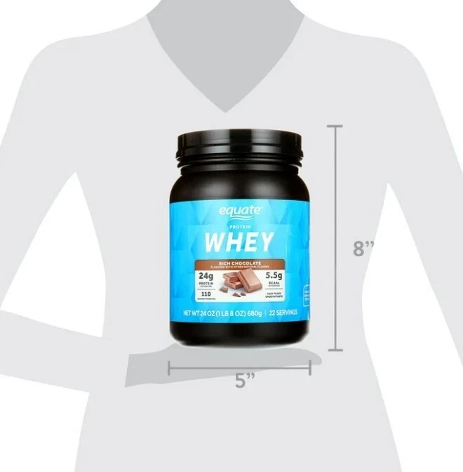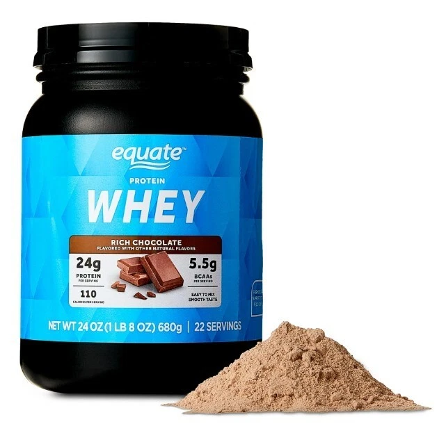 DO NOT SHIP TO NEW YORK Whey Protein Powder, Rich Chocolate, Mix With Cold Water, 22 Servings, 24 oz. Product details Equate Whey Protein Powder is a high-quality protein supplement designed to contribute to the growth and maintenance of muscle mass. Each serving delivers a whopping 24 grams of protein, making it an effective way to meet your daily protein needs. Along with this, it provides 5.5 grams of BCAAs per serving, which are crucial for muscle recovery and growth. The primary ingredient of this protein powder is Whey Protein Isolate, known for its high protein content, rapid digestion, and rich supply of amino acids. The chocolate flavor adds a smooth and delicious taste. This versatile protein powder can be conveniently consumed at any time - before or after workouts, in between meals, with meals, or whenever you need an extra protein boost. Equate Whey Protein Powder is an excellent choice for those looking to supplement their protein intake and support their fitness goals. Making the right health decisions can be challenging. With a complete range of products and simple solutions, Equate allows you to take care of your family with confidence. Equate Whey Protein Powder, Rich Chocolate, 24 oz With 24g of protein per serving, this product helps you meet your daily protein requirements for muscle growth and maintenance Each serving provides 5.5g of BCAAs, essential for muscle recovery and growth The #1 ingredient is Whey Protein Isolate Comes in a rich chocolate flavor, making it a tasty addition to your fitness regimen 22 servings Mix with cold water, milk, of other beverage