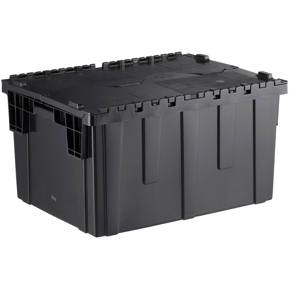 Transport and store your chafers safely thanks to this Choice 27 7/8" x 20 7/8" x 15 3/16" black stackable chafer tote / storage box! This box is an excellent way to store and transport chafers or your other catering equipment without the concern of damaging or losing parts along the way. Designed for long-lasting use in your commercial foodservice space, its high-density plastic material is impact-resistant, so you won't have to worry about scratches or dents during transport. There are also holes on the lid and box rim to allow you to lock the lid or secure it with zip ties. Plus, the quick-release label area on the hinged cover allows for easy reading and simple label changes! When it comes time to lift the box, you can count on the ergonomic integrated handles for easy lifting. Its convenient interlocking hinged lid not only keeps the box tightly sealed and stable during transport, but it also makes this box capable of stacking for easy storage. Since the lid is attached, you won't ever lose it during use or transport. When the chafer tote is empty, it nests with small and large Choice storage boxes to save additional storage space. With its many great features, this Choice chafer tote / storage box is a must-have for your catering service! Exterior Dimensions: Top Length: 27 7/8" Top Width: 20 7/8" Bottom Length: 25 13/16" Bottom Width: 18 13/16" Height: 15 3/16" Interior Dimensions: Top Length: 26" Top Width: 19" Bottom Length: 25" Bottom Width: 18" Product Clearance: 14" 7972805