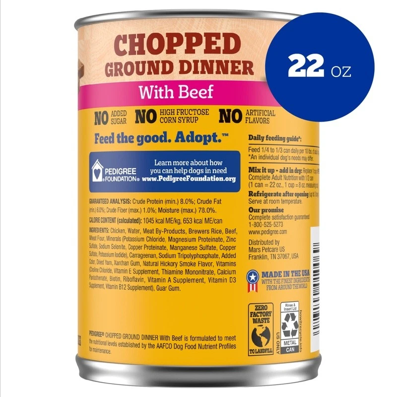 Dogs bring out the good in us. brings out the good in them. Express your love for your dog by serving Chopped Ground Dinner. Chopped Ground Dinner Adult Canned Soft Wet Dog Food With Beef is made with real beef for a familiar flavor your dog will appreciate. This wet canned soft dog food is 100% complete and balanced for adult dogs. It is made without added sugar, high fructose corn syrup, and artificial flavors. Chopped Ground Dinner goes great as a topper, mixed with dry dog food, or served on its own so you can be confident you’re feeding your dog a quality recipe they will love however it is served. 12 Pack Chopped Ground Dinner Adult Canned Soft Wet Dog Food With Beef is made with real beef. This canned wet dog food is 100% complete and balanced for adult dogs. Made with no added sugar, high fructose corn syrup, or artificial flavors. Can be used as a topper, mixed with dry dog food or served on its own for an extra tasty meal. brand believes all dogs make the world a better place. Every dog deserves a loving home.