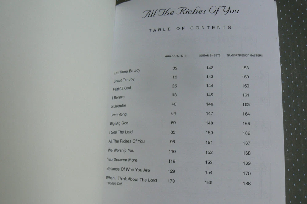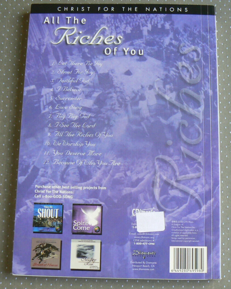 All the Riches of You Christ for the Nations Songbook Piano * Vocal * Guitar * Overhead Masters 12 songs (listed on back of book in photo) This 188-page softcover is in like-new condition with all pages crisp, clean, and sturdily bound; even the cover is nice and smooth. You won't be disappointed! ~~~~~~~~~~~~ I'm listing MANY more books and other items. I'm happy to combine shipping. ~~~~~~~~~~~~~~~~~~~~~~~~~~~~ I normally mail ON the day I receive payment if it's received before 1 p.m. central time, and the next day if it's later than 1. Please take a look at my other listings; I'm listing many school books (and other items) and am happy to combine shipping! Items from smoke-free, pet-free home. Thanks so much for your time! Before leaving your feedback, if for any reason you feel I did not deserve or earn 5 stars in each category, please let me have the opportunity to make it right. I want every transaction to be 5-star worthy! Thanks so much! :)