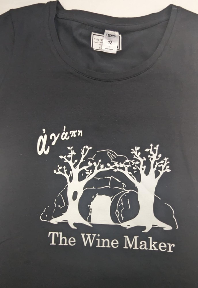 This unisex Christian T-shirt features a black fabric with a round neckline and short sleeves. The shirt is made of 100% cotton material and has a relaxed fit. The design includes the phrase "The Wine Maker" and "Agape - Order of Melechizedek" in white font, making it a great addition to your Christian wardrobe. This T-shirt is part of the Tiny Town Christian Shirts product line and is available in size 12. It is machine washable and perfect for spring. The shirt is not vintage but is still a unique addition to your wardrobe. Make a statement with this walking billboard and show off your faith with pride.EB00694 BIN 012