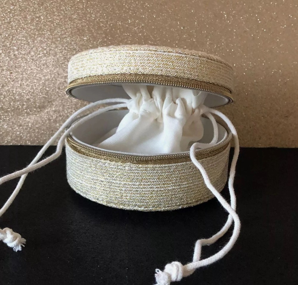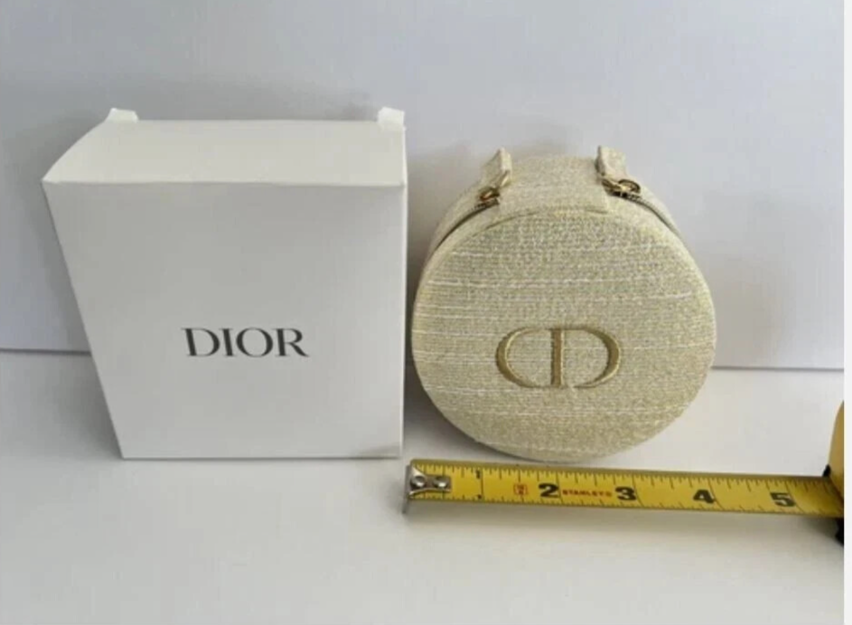 CHRISTIAN DIOR Gold Trousse Pouch Cosmetic Bag Jewelry Round Box New This cute round box has a built in bag so you can place your jewelry or mini Perfume in it when traveling or to keep on your counter. It’s a sparking looking gold round container with an embroidered CD and has a zipper closure. Measurements appr: 3.75'' x 2 '' Authentic item Made for Dior perfume line