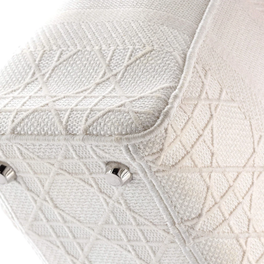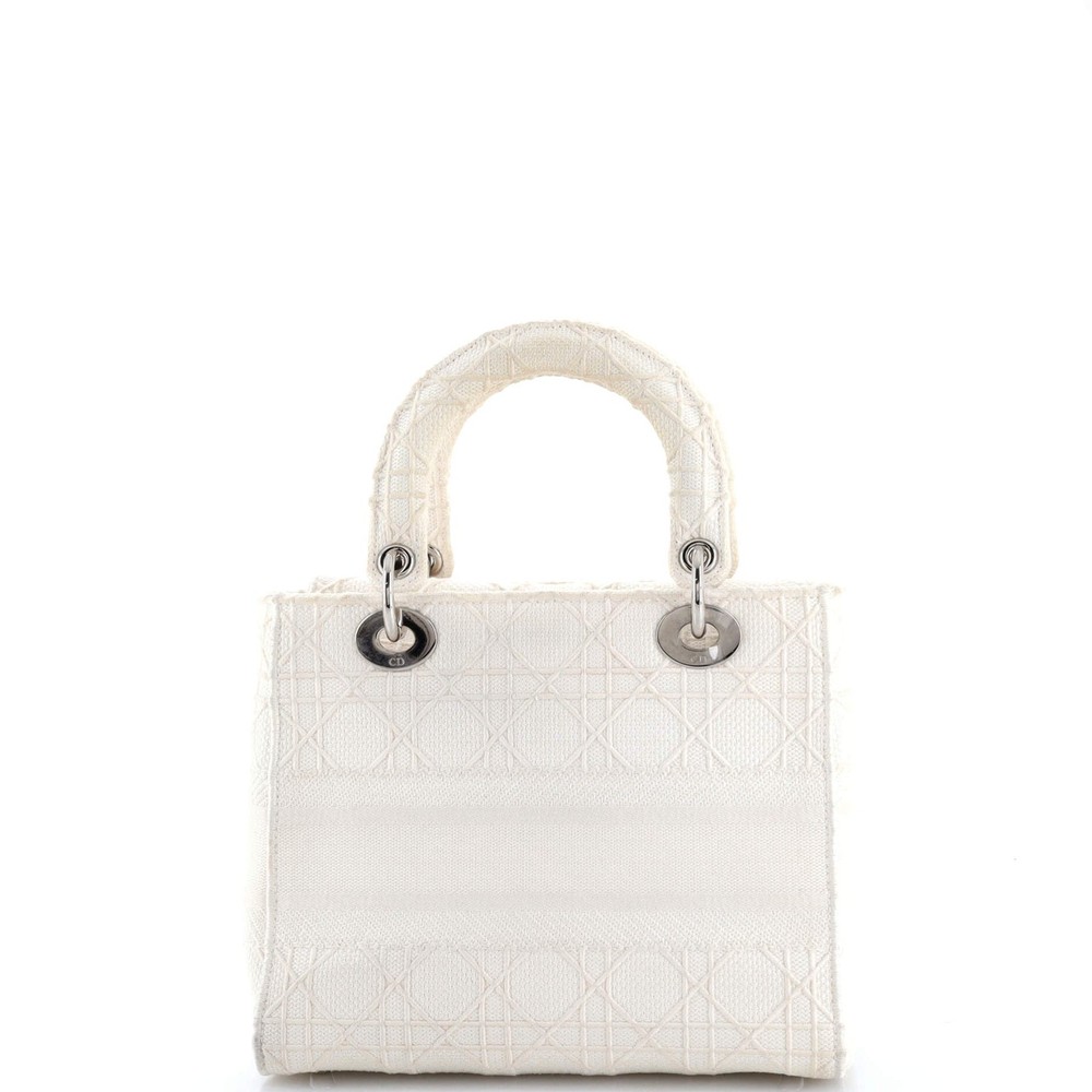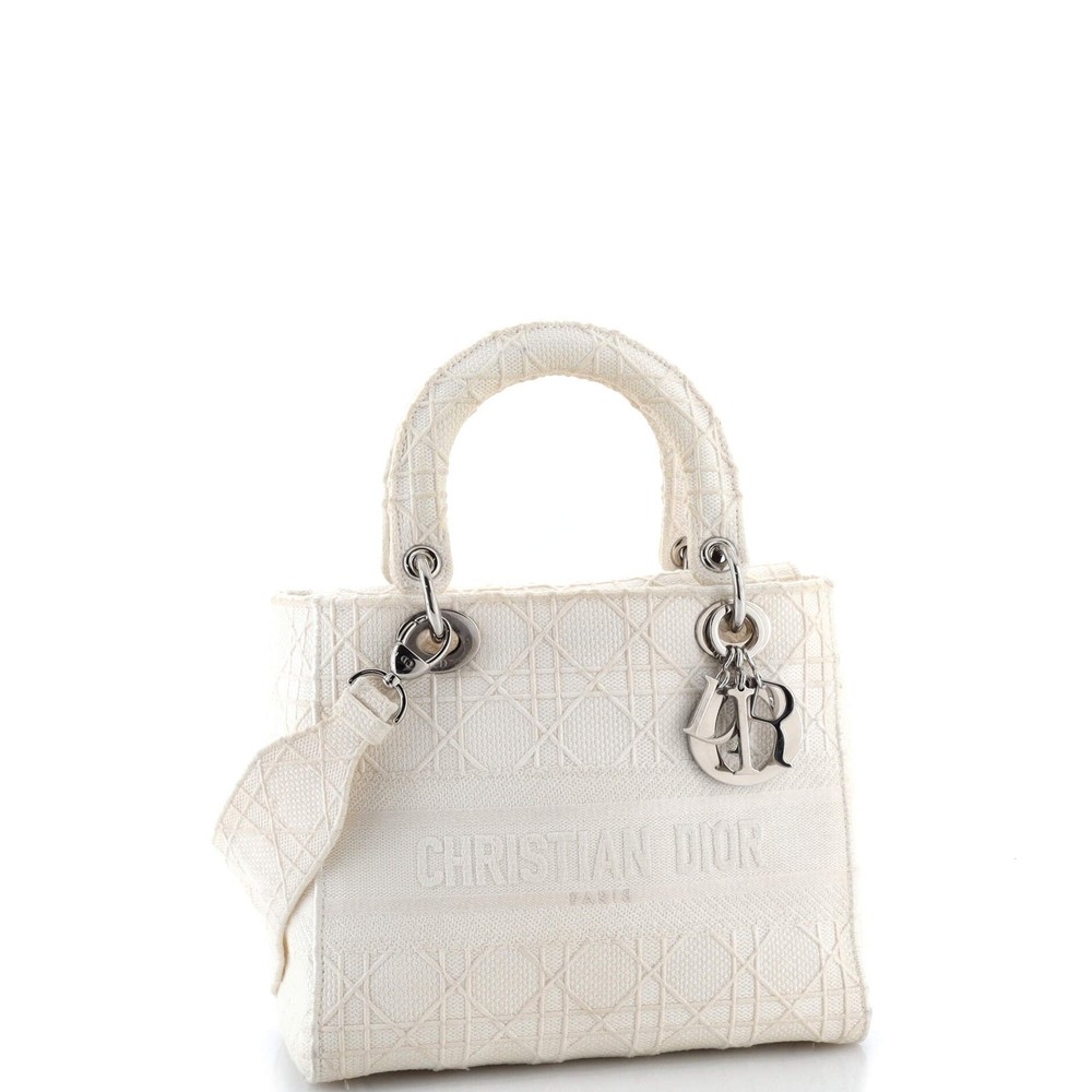 These are professional pictures of the actual item offered by Rebag. Estimated Retail Price: $5,300 Condition: Good. Exterior: edge wear, discoloration, minor creases | Handles/Straps: scuffs, discoloration, minor creases | Interior: scuffs, discoloration | Hardware: scratches, tarnished Accessories: Dust Bag, With Strap Measurements: Handle Drop 4", Height 8", Width 9", Depth 3.5", Strap Drop 20" Designer: Christian Dior Model: Lady D-Lite Bag Cannage Embroidered Canvas Medium Exterior Material: Canvas Plain Exterior Color: Neutral Interior Material: Canvas Plain Interior Color: Neutral Hardware Color: Gold Tone Item Number: 348355/6
