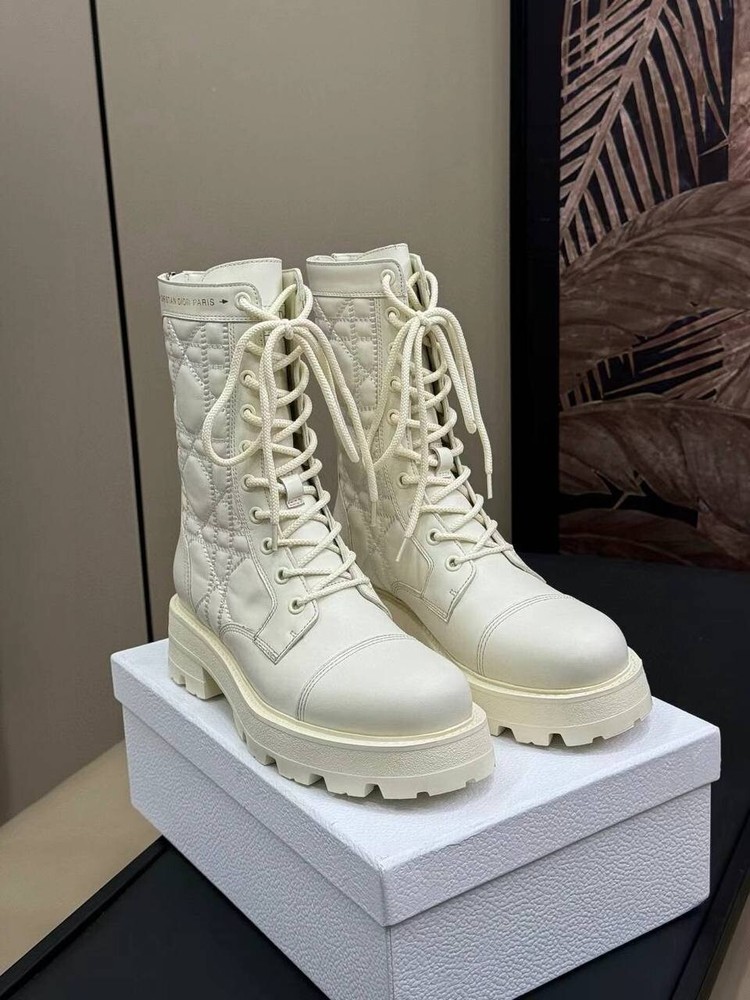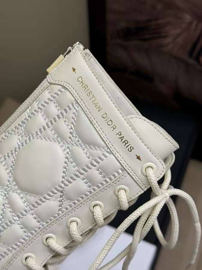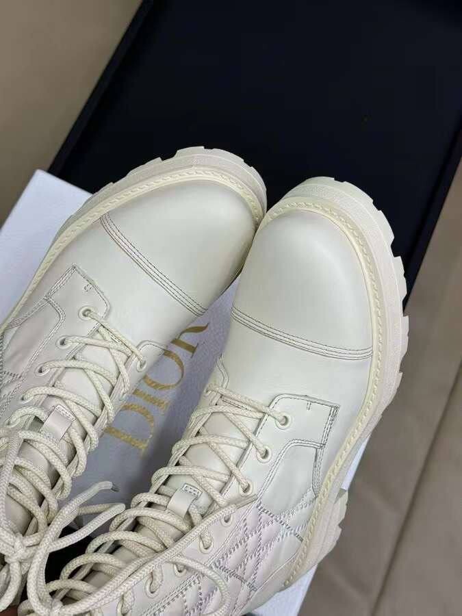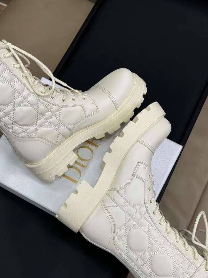 Step into elegance with these Christian Dior ankle boots, a seamless blend of luxury and comfort. Crafted with premium white leather, these boots are a versatile addition to any wardrobe, easily elevating a casual outfit or adding a touch of sophistication to your evening attire. Designed with the modern woman in mind, the boots feature a durable rubber outsole for reliable traction and a size EU 39 / US 8.5 fit that ensures a comfortable experience with every step. Whether you're strolling the city streets or attending a chic event, these Dior boots are sure to make a statement. These Cannage quilted calfskin boots feature gold-tone "CHRISTIAN DIOR PARIS" lettering on the back, while the rubber and leather sole adds a contemporary touch.