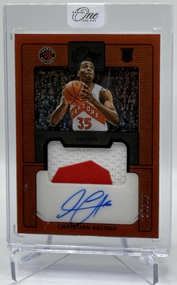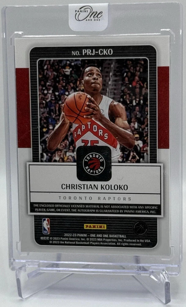 Up for sale is a Christian Koloko 2022-23 Panini One And One Purple Prime Rookie Jersey on-card autograph, card #PRJ-CKO, serial numbered 23/35 for the Toronto Raptors. Any scratches seen are on the one-touch case only.