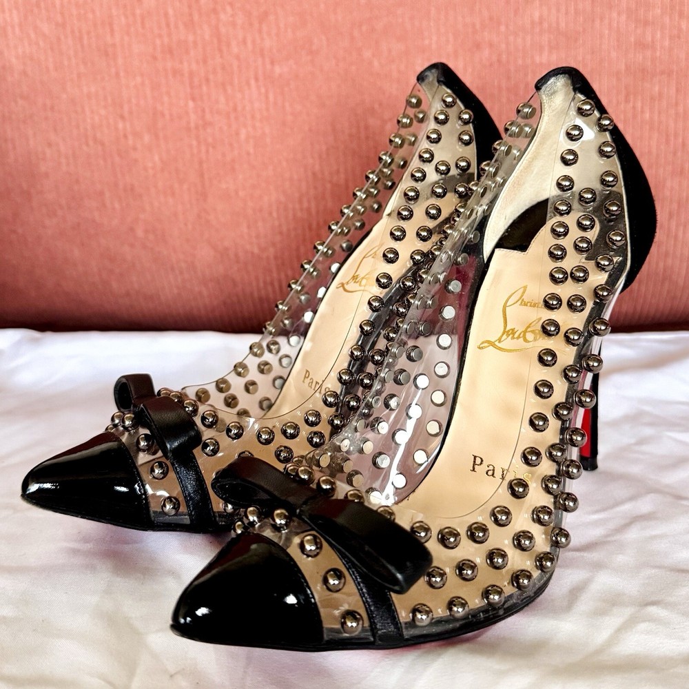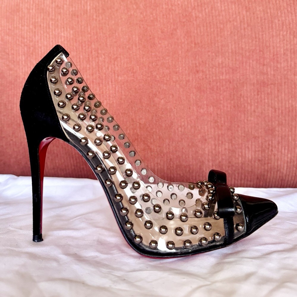 -slip-on point toe pumps with black patent leather cap toes tipped with black leather bows, black suede heels, clear PVC upper studded with polished gunmetal silver pearls, and iconic red bottoms -size EU 35.5 // US 5.5 -great condition; worn 2-3 times- general wear on the bottoms -~4.5” stiletto heel -upper material: PVC, suede, leather, & patent leather -lining material: PVC -insole & sole material: leather -hardware: gunmetal silver -origin: Italy -comes with extra heel tips and pearl studs in cute little red baggies :)