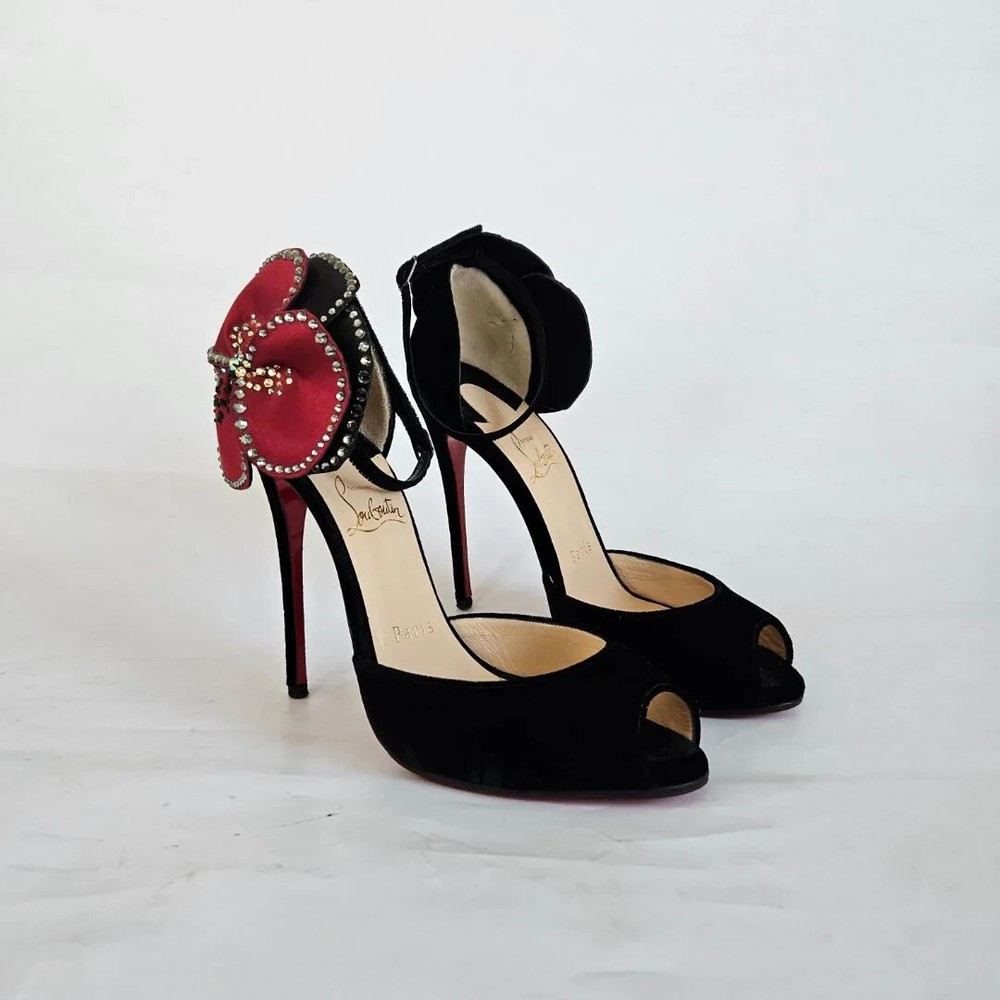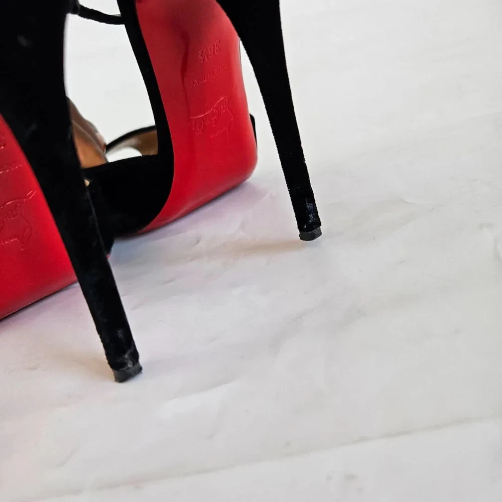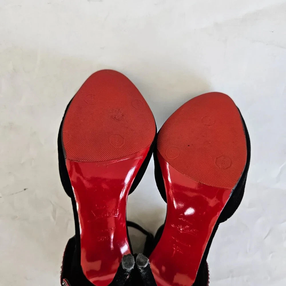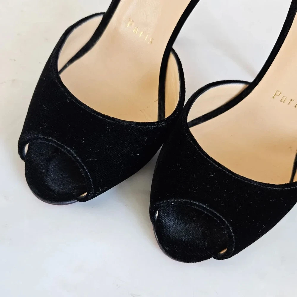 Christian Louboutin black velvet Pensamoi sandals Material: Suede Color: Black Size: 36.5 Heel height: 10.5 cm Condition: Excellent; used gently; outsole has been protected