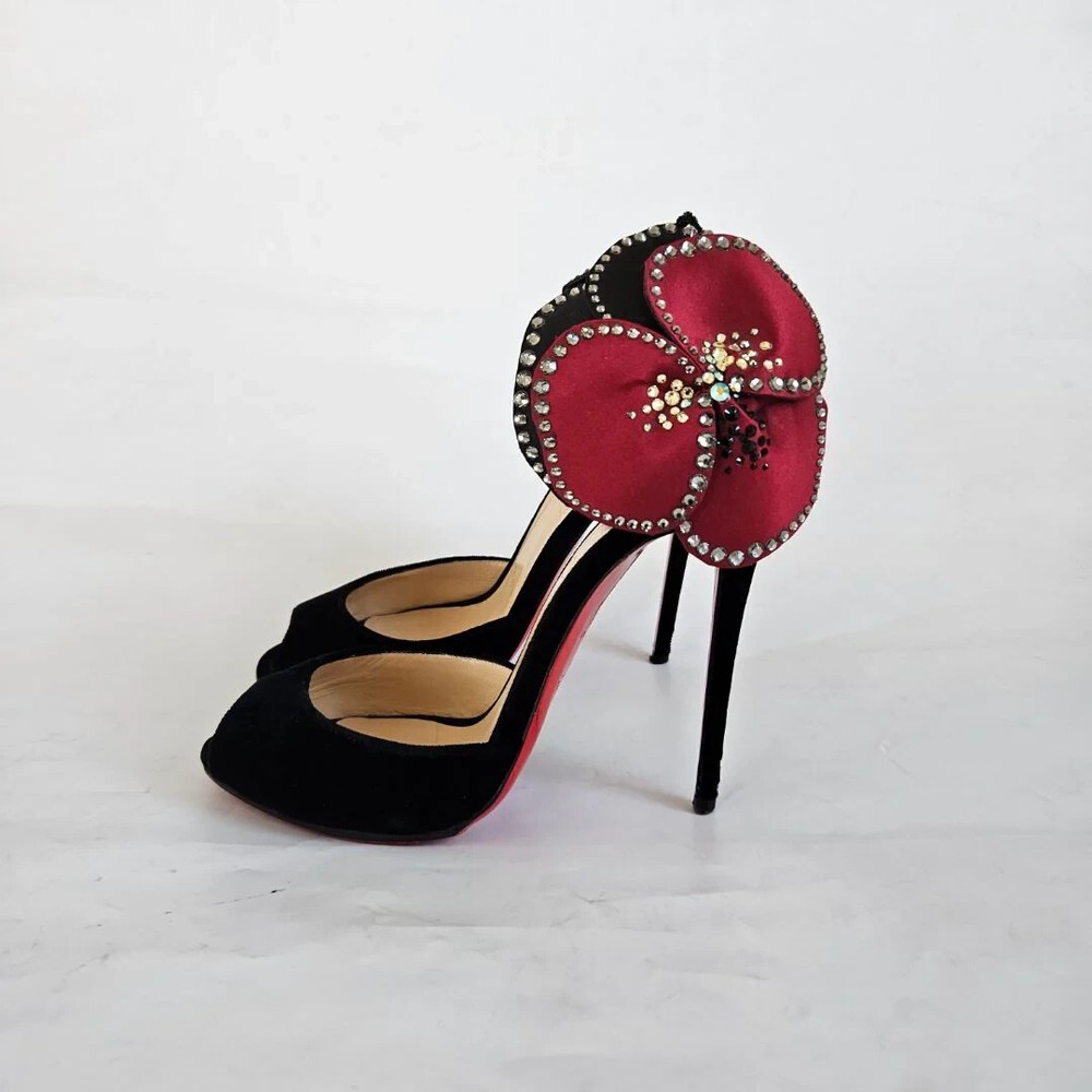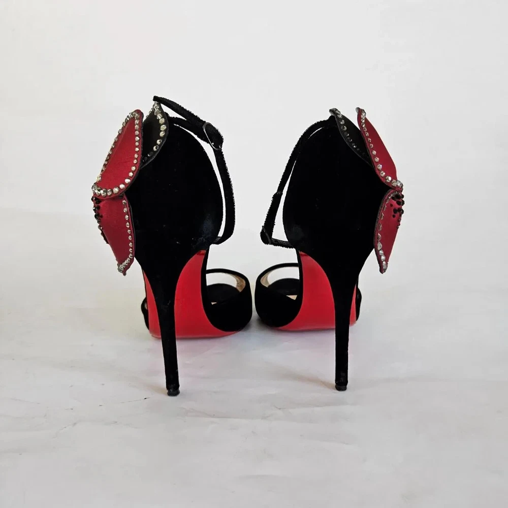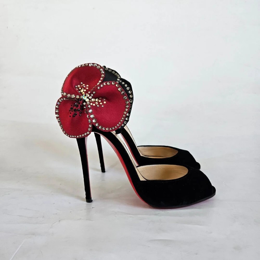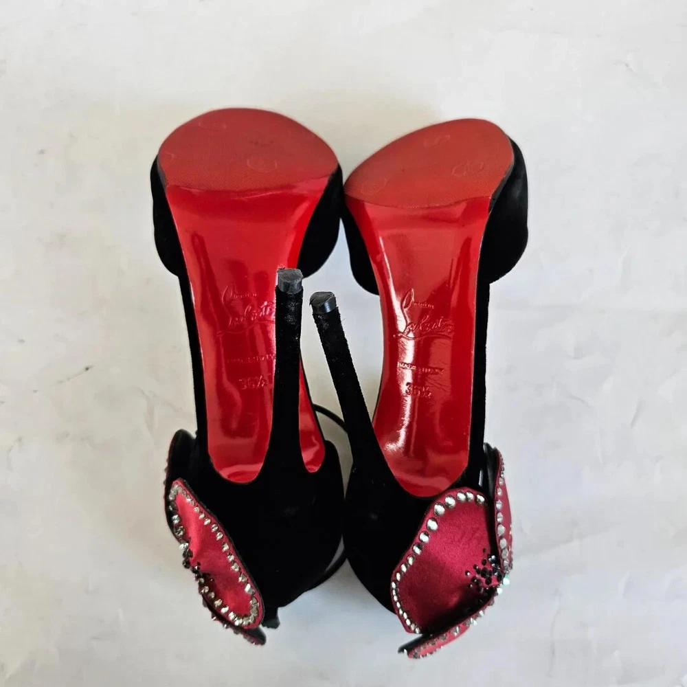 Christian Louboutin black velvet Pensamoi sandals Material: Suede Color: Black Size: 36.5 Heel height: 10.5 cm Condition: Excellent; used gently; outsole has been protected