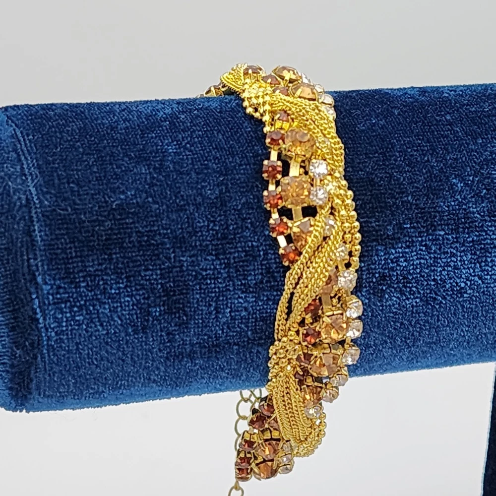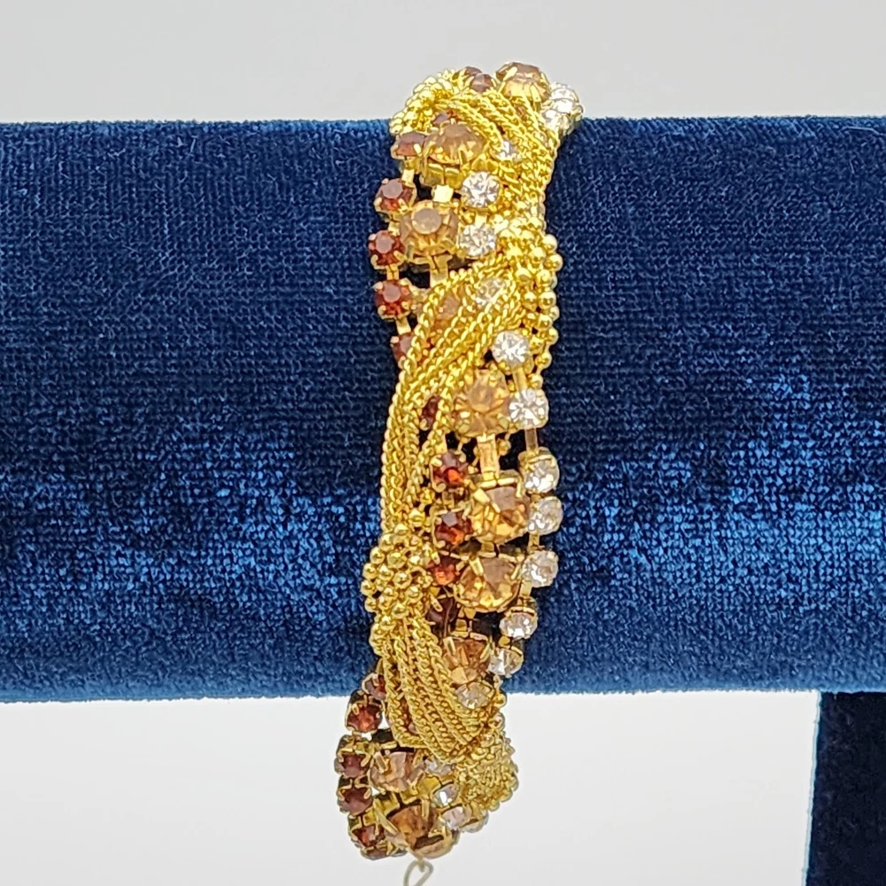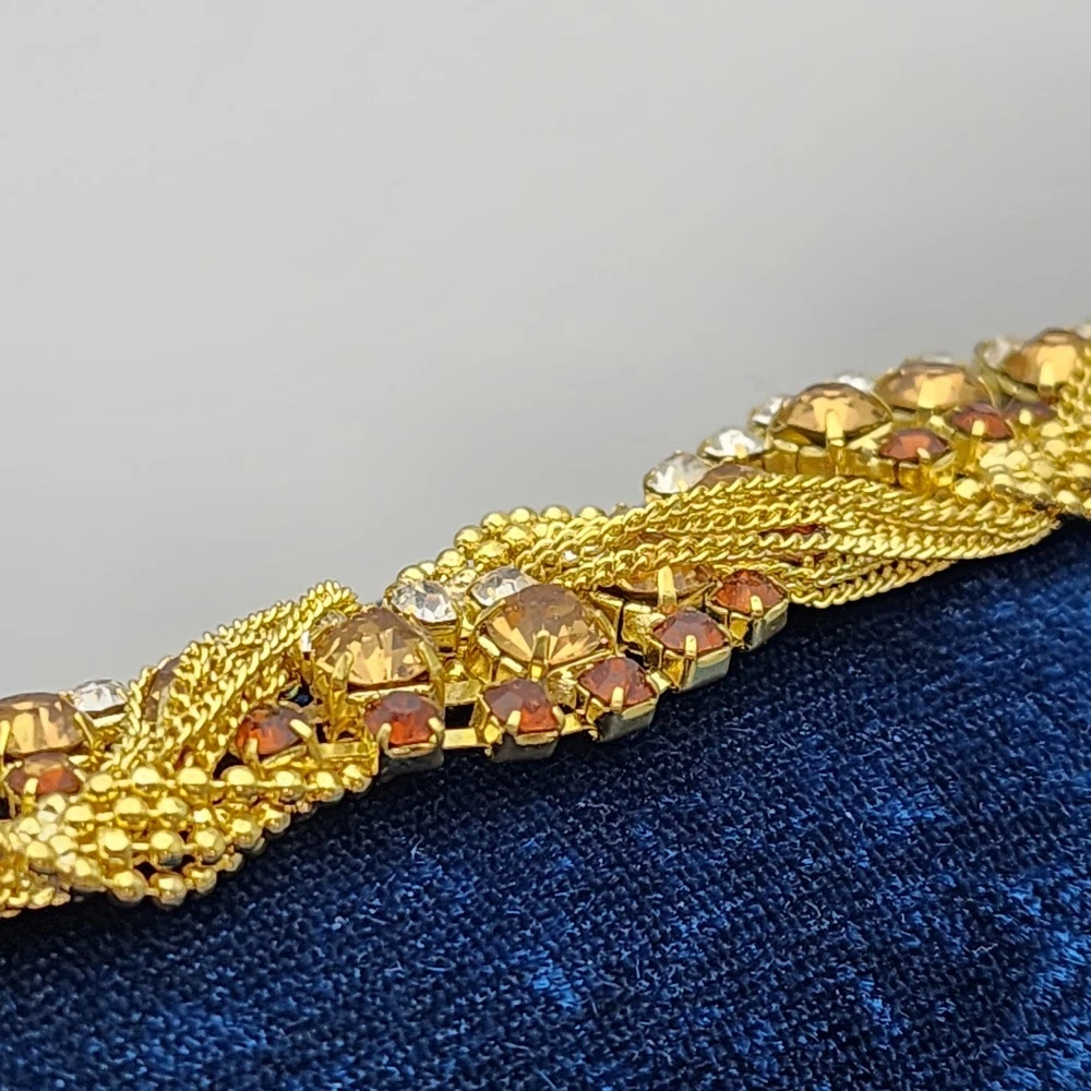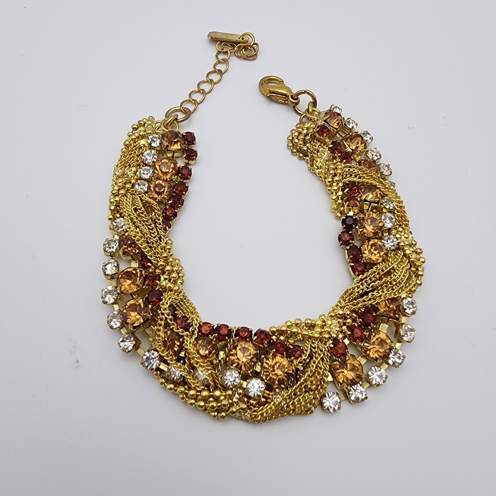 Amber & Clear Crystal Prong Set Rhinestones Gold Tone Twisted Chain by Christina Collection. Very Sparkly And Bright Colored Crystals. Strands On Bracelet Are Braided Together. 7" with 2" Extender.