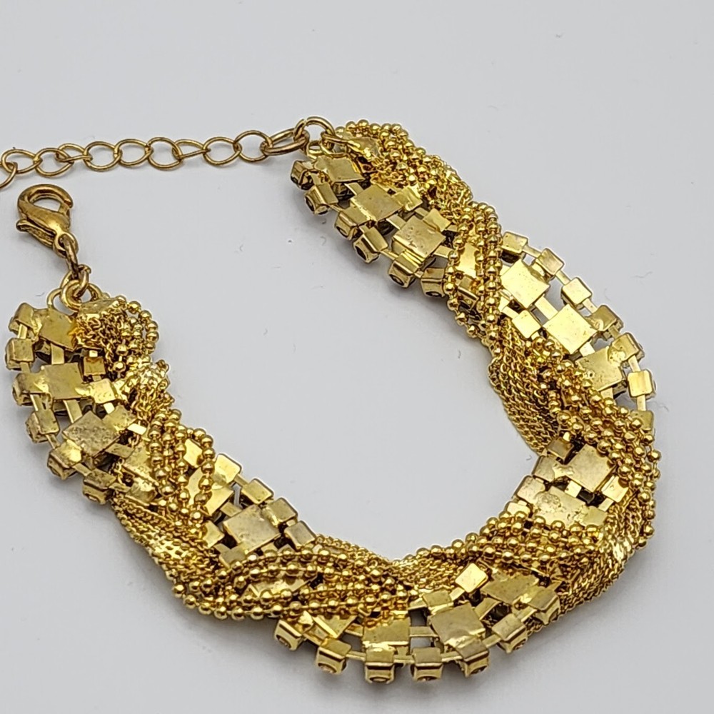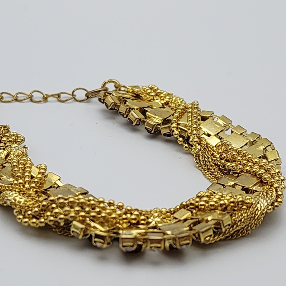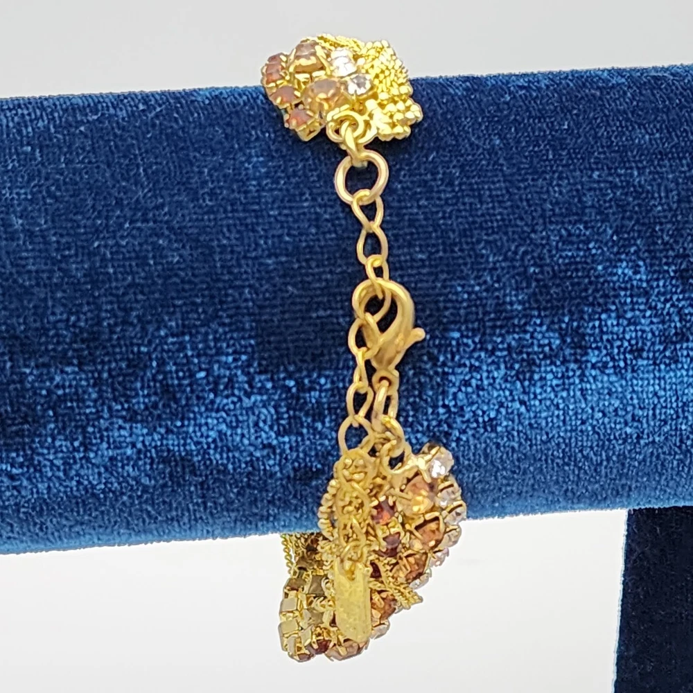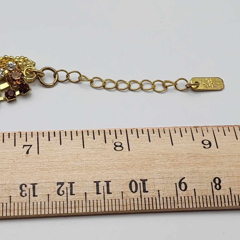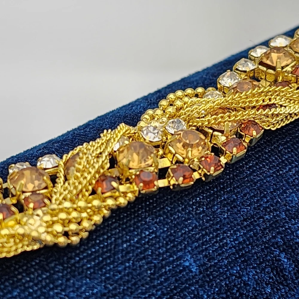 Amber & Clear Crystal Prong Set Rhinestones Gold Tone Twisted Chain by Christina Collection. Very Sparkly And Bright Colored Crystals. Strands On Bracelet Are Braided Together. 7" with 2" Extender.