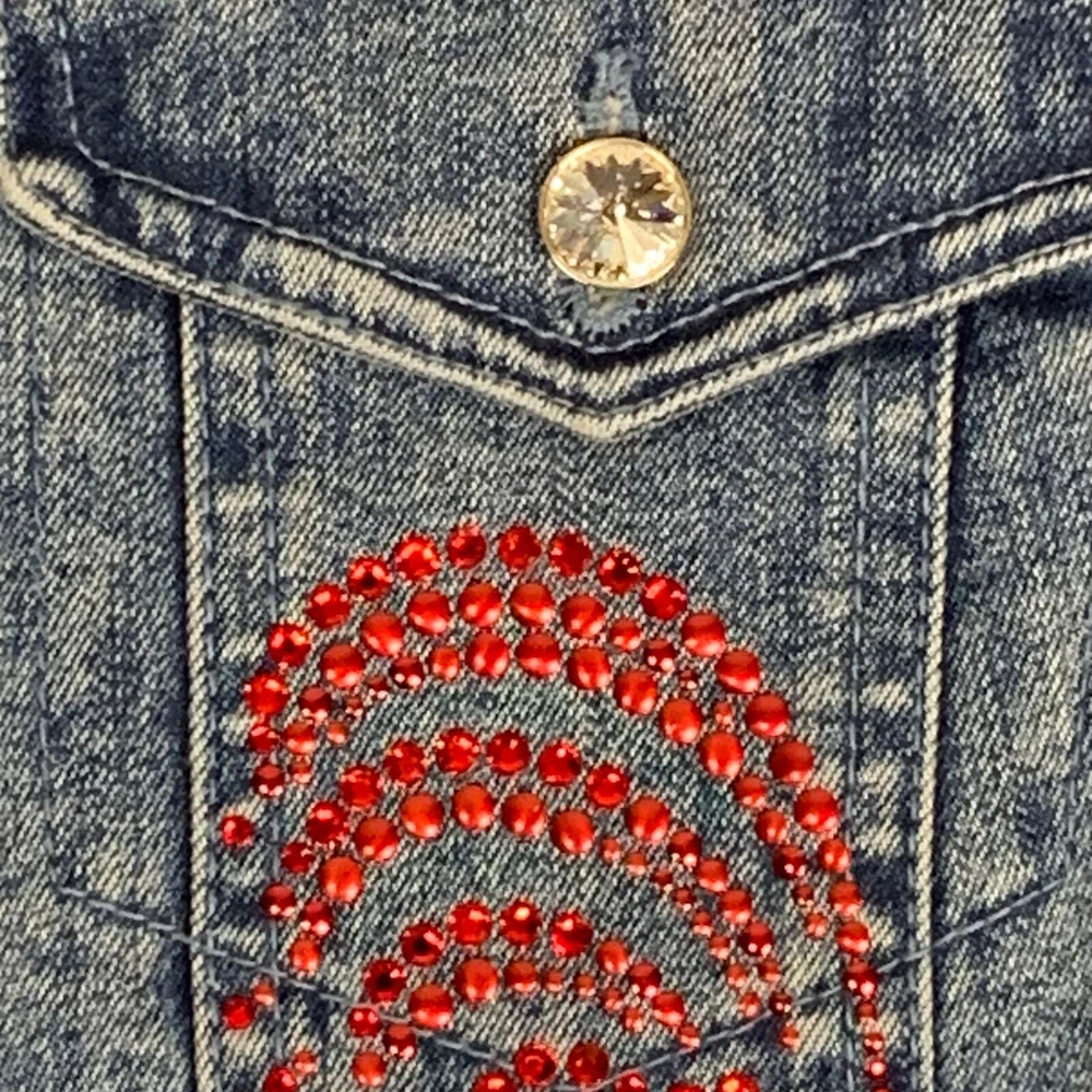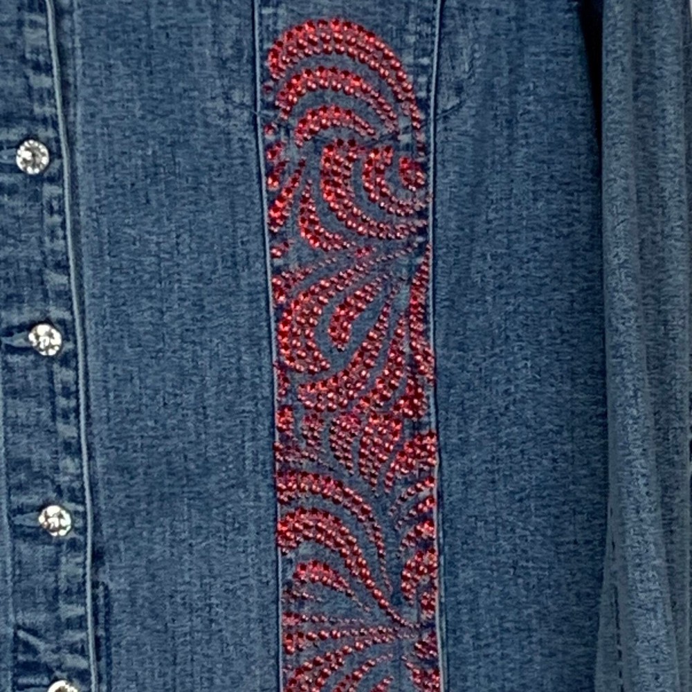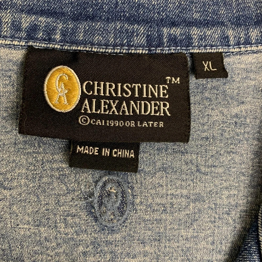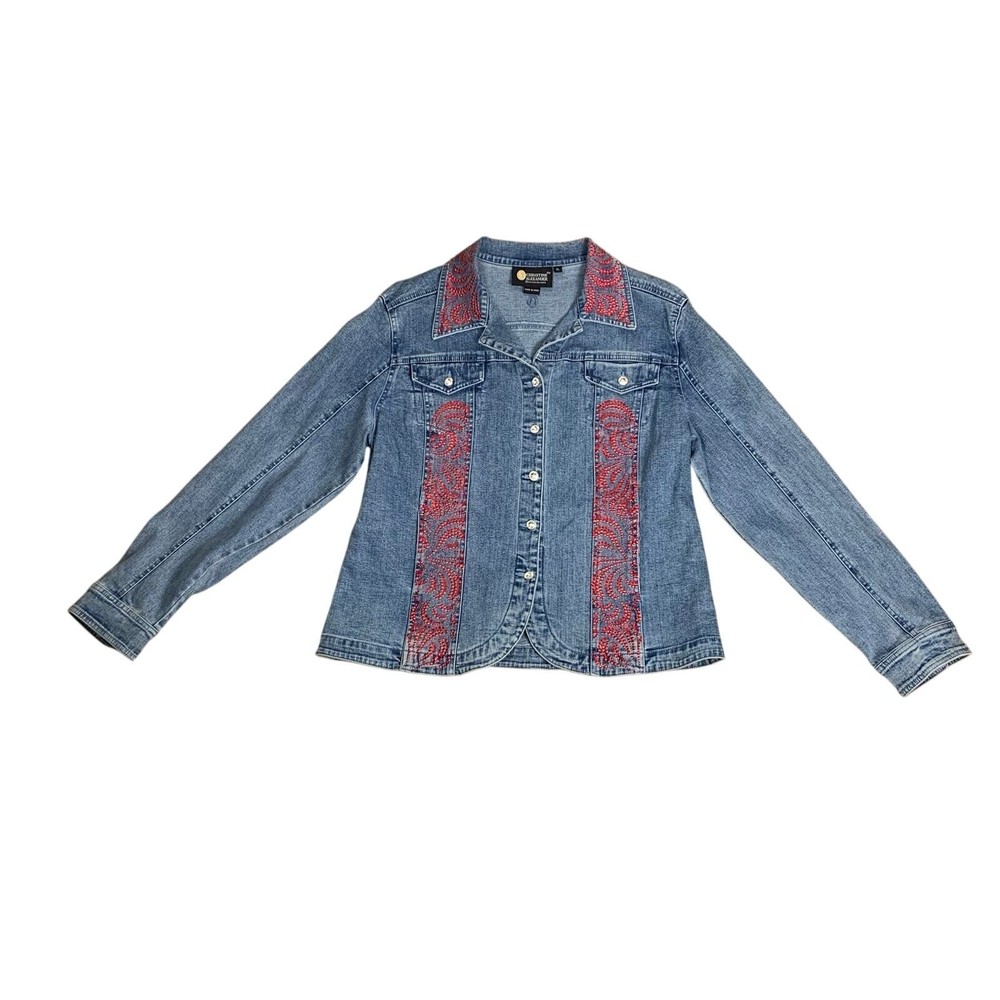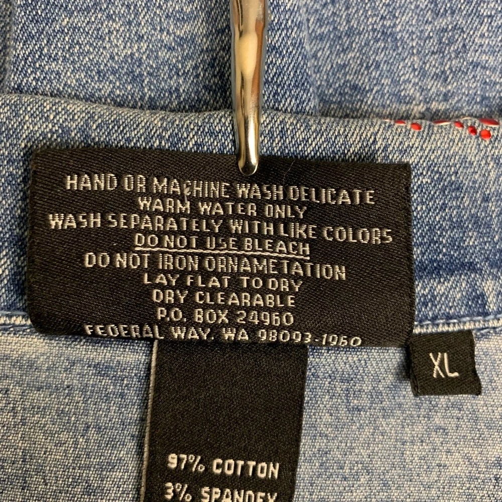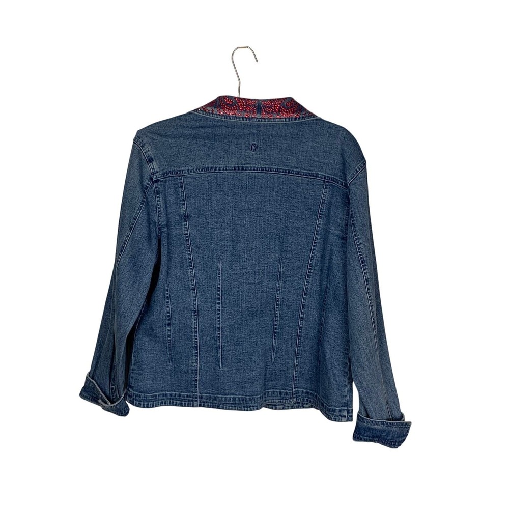 Christine Alexander Tailored Denim Trucker Jacket With Red Swarovski Crystals- Size XL Feminine cut with a curved hem Swirly red Swarovski Crystals in on the front and collar Silver / Clear large rhinestone buttons Cropped Front chest pockets Back Darts create a slight peplum Medium wash denim SIZE: XL CONDITION: Excellent Used Condition MEASURMENTS: Bust: 21 " Length (back of collar to hem): 24" *Consistent 5 Star Seller - Shipping M, W, F & SA *Feel free to Send me an OFFER - All Reasonable OFFERS Welcome! *From a Smoke-Free/Pet Friendly Home *Check out my closet for other similar sizes & don't forget to BUNDLE for more Discounts!! TAGS: Christine Alexander Tailored Denim Trucker Jacket With Swarovski Crystals - Size XL Medium wash denim jacket Denim Jacket with bling denim coat Rhinestone denim jacket Red rhinestone jacket Blinged-out jean jacket Sparkly tailored denim jacket Country glam jacket Curved hem jean jacket Shimmering Swarovski Crystal buttons Western statement jacket Peplum back denim jacket Feminine cut denim jacket Festive rhinestone jean jacket maximalist denim jacket Shiny casual layering piece Blingy western style denim jacket Coastal grandma jean jacket Canadian tuxedo jacket Tailored denim jacket XL Sparkly casual jacket Swirly red Swarovski Crystals jacket Designer denim jacket Holiday party denim jacket Statement jean jacket Medium wash feminine jean jacket Shimmery peplum jean jacket Stylish western rhinestone jacket Bedazzled Trucker Jacket