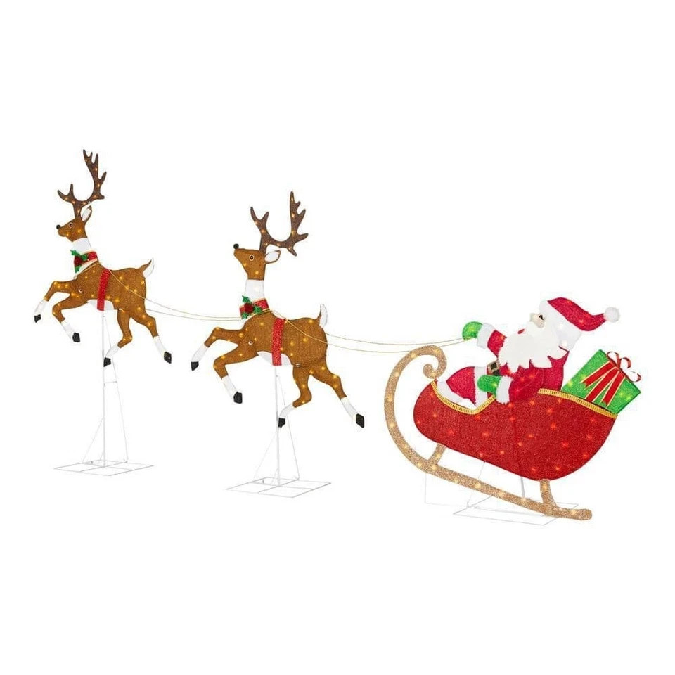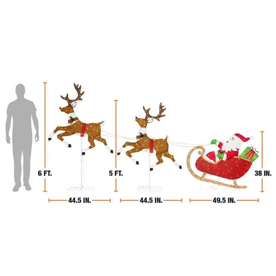 Create a festive Christmas display with this 6 ft. Yuletide Lane LED Santa's Sleigh with Reindeer from Home Accents Holiday. This reindeer is suitable for indoor or outdoor use. Reindeer leg lights alternate to simulate movement. Reindeer light functions include steady, slow, and medium movement. It has 198-warm white LED lights and durable pre-wired metal frame. It plugs into a standard outlet for flexible placement. Ground stakes, spare bulbs and fuses are included. It's the perfect yard decoration for your home, front porch, or yard. Pair with other Yuletide Lane holiday items. Indoor/outdoor use 198 warm white LED lights LEDs offer energy-efficient illumination Durable pre-wired metal frame Ground stakes, spare bulbs, and fuses included Plugs into a standard outlet for flexible placement Suitable for decorating your home, front porch