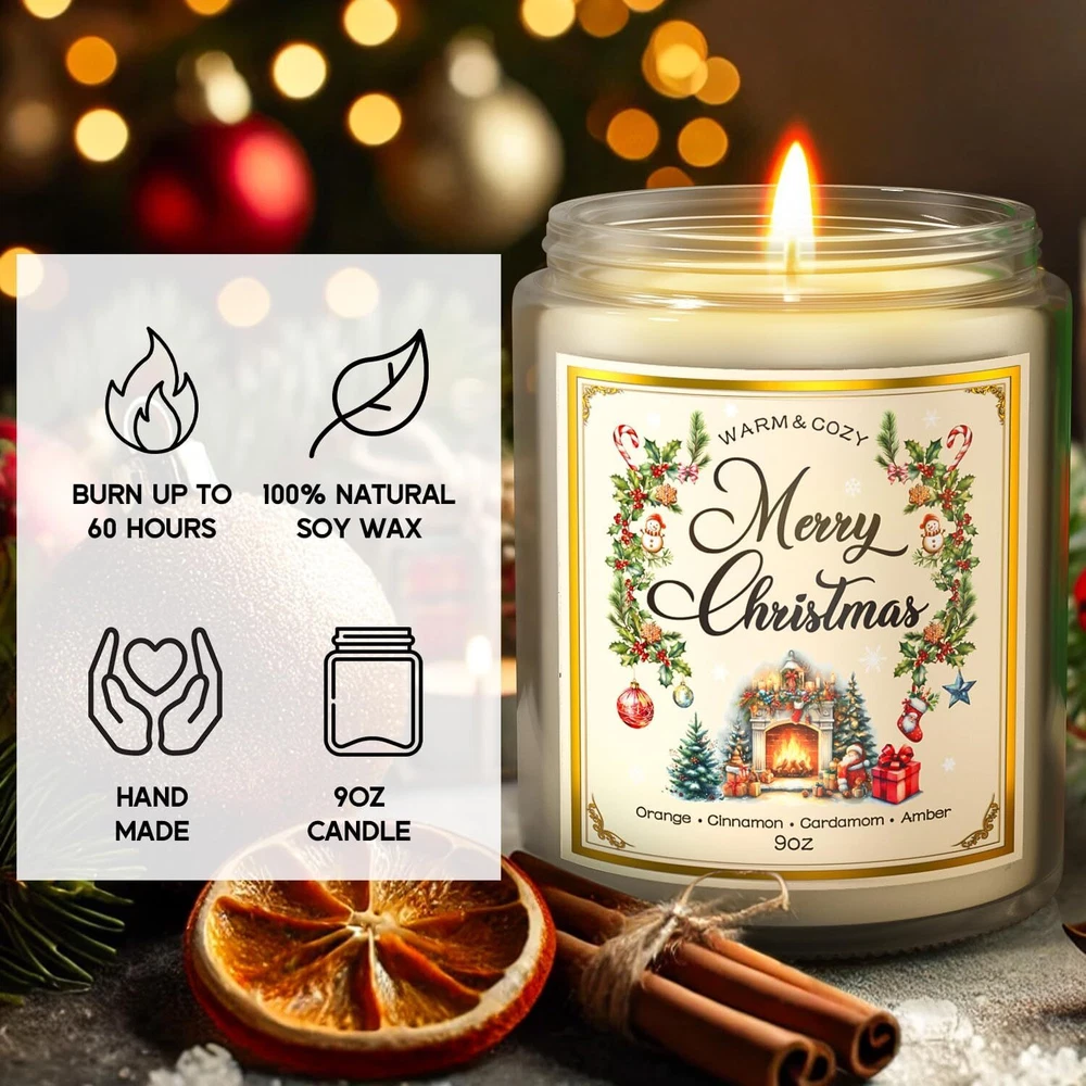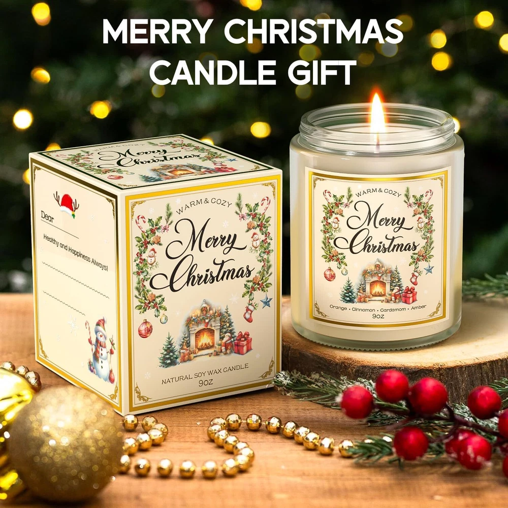 Christmas Candles, VEGISHINE 9oz Scented Merry Candle Product Details Product Dimensions : 3.5 x 3.5 x 4.5 inches; 4.8 ounces Item model number : VEGISHINEUS001 Manufacturer : VEGISHINE Country of Origin : China Brand: VEGISHINE Color: Merry Christmas Candle Product Dimensions: 3.5"W x 4.5"H Item Weight: 0.3 Pounds Number of Items: 1 Scent: Orange&Cinnamon&Cardamom&Amber Are Batteries Included: No Indoor/Outdoor Usage: Outdoor, Indoor Specific Uses For Product: Relaxation, Home Fragrance, Aromatherapy, Celebration, Decoration Shape: Round Christmas Candle Gift: VEGISHINE Christmas Candle, fragranced with the cozy scent of cinnamon spice and warm orange, adorned with festive red and green accents. Featuring "Merry Christmas" on the candle, it’s the perfect gift to spread joy, warmth, and holiday cheer. Warm Christmas Scent: VEGISHINE Christmas candle has a cozy scent that mixes the freshness of orange, the warmth of cinnamon, the spice of cardamom, and the sweetness of amber. When lit, it fills the room with a festive and comforting aroma, making your space feel warm and inviting for the holidays. Christmas Gift for Women: Thoughtfully designed packaging enhances the beauty of the candle, making it an elegant addition to any Christmas décor, while creating a cozy and inviting holiday atmosphere. Long-Lasting Burn: Hand-poured with premium ingredients, this Christmas candle burns for over 60 hours, allowing the holiday spirit to linger throughout the season. Versatile Use: Suitable for any room in the home, from the living room to the dining room, bedroom, or kitchen. This candle is the perfect Christmas gift for women, men, friends, family, loved ones, or even as a treat for yourself during the festive season.