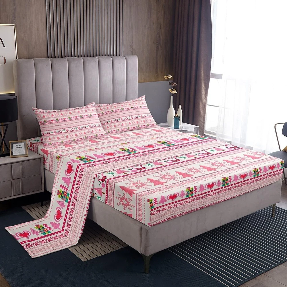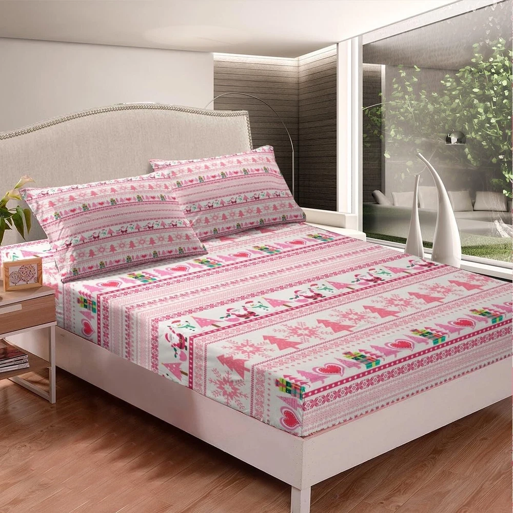 Product Dimensions: 80 X 60 X 0.2 Inches Material: Microfiber Closure Type: Elastic String gtin13: Does not apply Character: Santa Claus UPC: Does not apply Item Dimensions L X W X H: 80 X 60 X 0.2 Inches Theme: Cartoon,christmas,snowflake Seasons: All, Winter, Summer, Fall Product Care Instructions: Machine Wash, Do_not_bleach Style: Modern Number Of Pieces: 4 Type: Details In Description Item Weight: 2.95 Pounds Age Range (description): Kid Size: Queen Pattern: Modern Color: Pink Included Components: Flat Sheet & Fitted Sheet & Pillow Case Room: Bedroom Cartoon Character: Christmas Brand: Unbranded