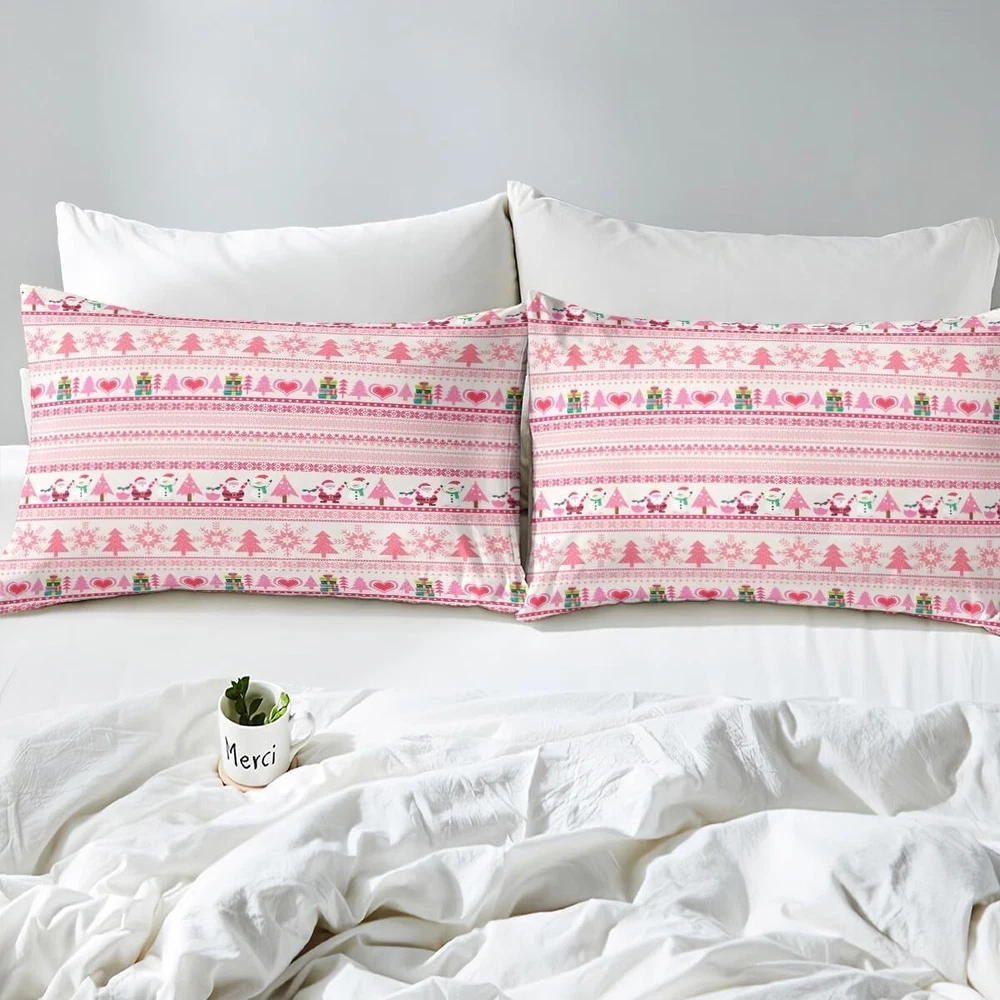 Christmas Comforter Cover Cartoon Santa Claus Snowman Sheet Set Pink Snowflak...