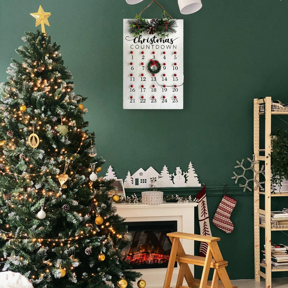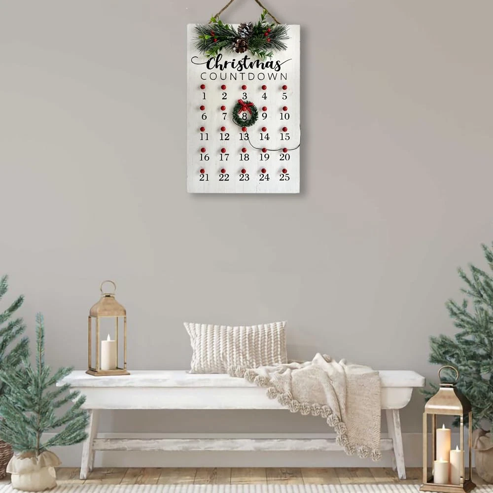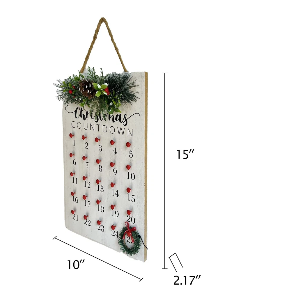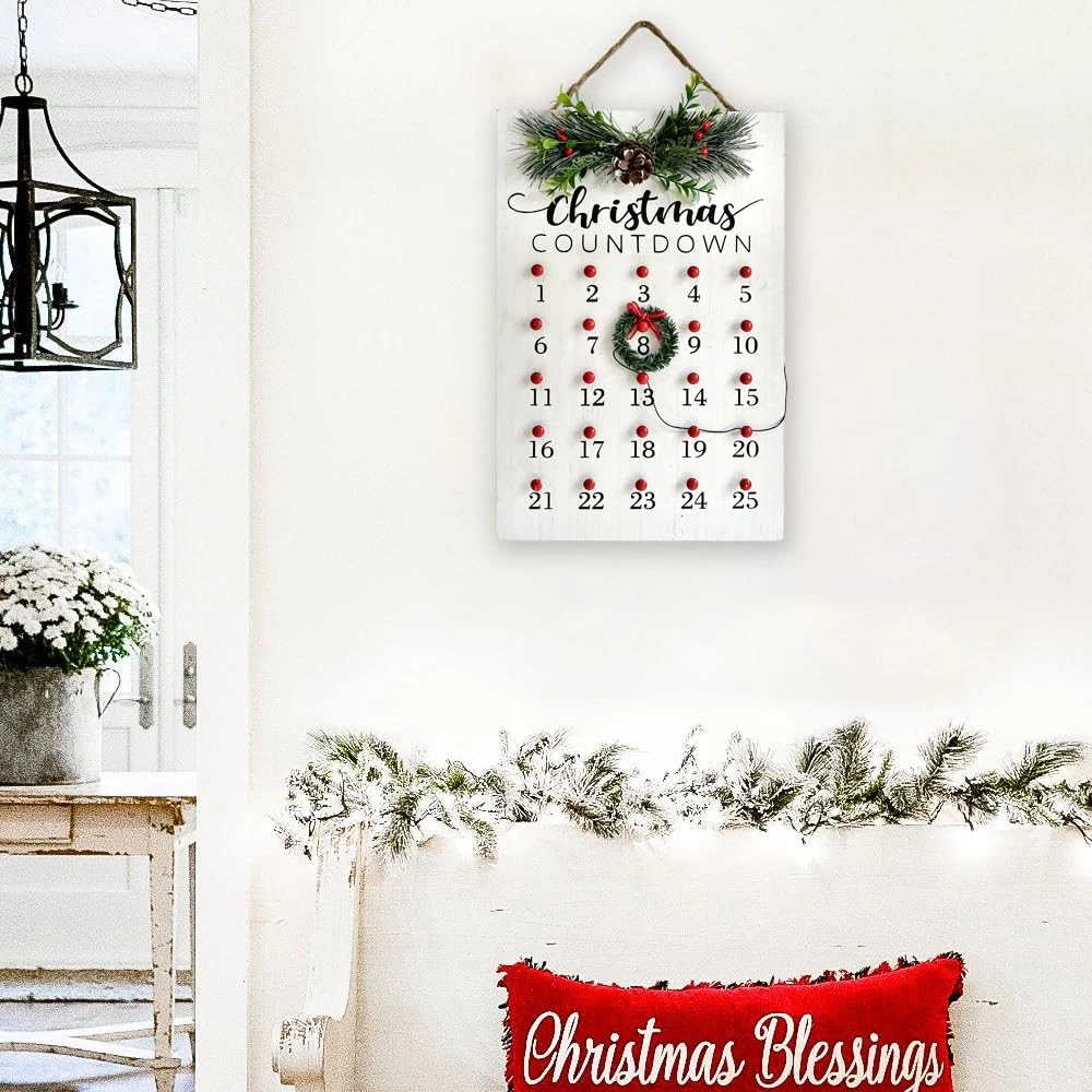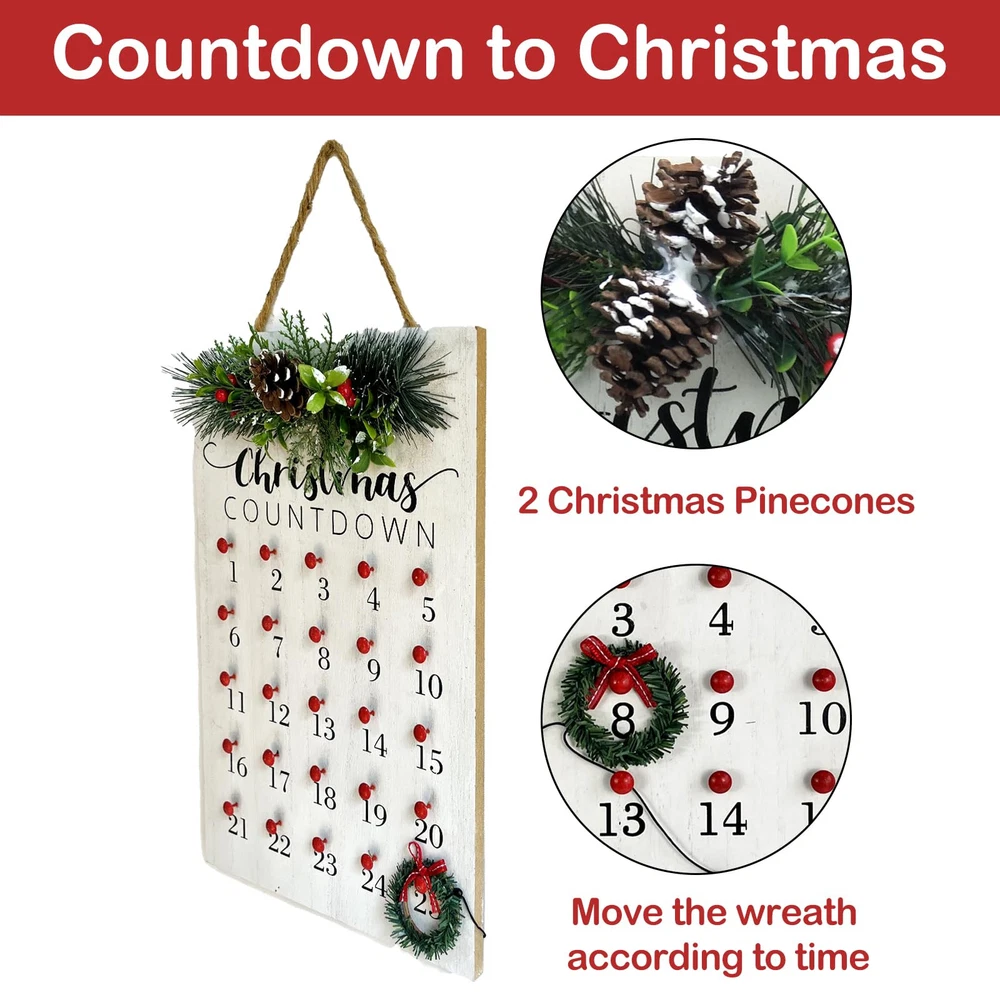 CHRISTMAS COUNTDOWN: Christmas Calendar comes with Pine Cones and wreath, you can move the position of the wreath according to the time, and the whole family gathers in anticipation of the new year, countdown to Christmas and the arrival of Santa Claus CHRISTMAS DECORATIONS FOR HOME: Red and white countdown to Christmas, adds character to your house. Brightly colored sign can make your home warmer, add more Christmas atmosphere, celebrate the arrival of the New Year with family STRONG & DURABLE: Made of high quality solid wood, thick and sturdy, odorless, not easy to break or deformation. Nice clear printed with vivid colors, does not peel or fade. Carefully polished creates smooth surface without burrs. Size: 15" x 10" x 2.17" PERFECT ADDITION: Hang it or place it on the mantelpiece, or wherever that needs a piece of cheer. Perfect to hang on your front door or celebrate Christmas and winter in your home, with wooden signs to enhance your Christmas decor and add holiday fun IDEAL HOLIDAY GIFT: Perfect choice for New Year gift, give your family, friend, colleague to wish them a happy New Year, express New Year wishes to them, get together to celebrate the joy of Christmas, and can express your taste in art to them