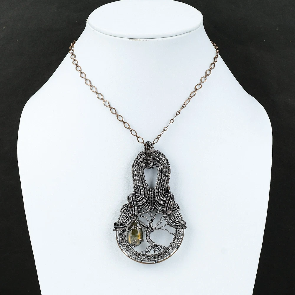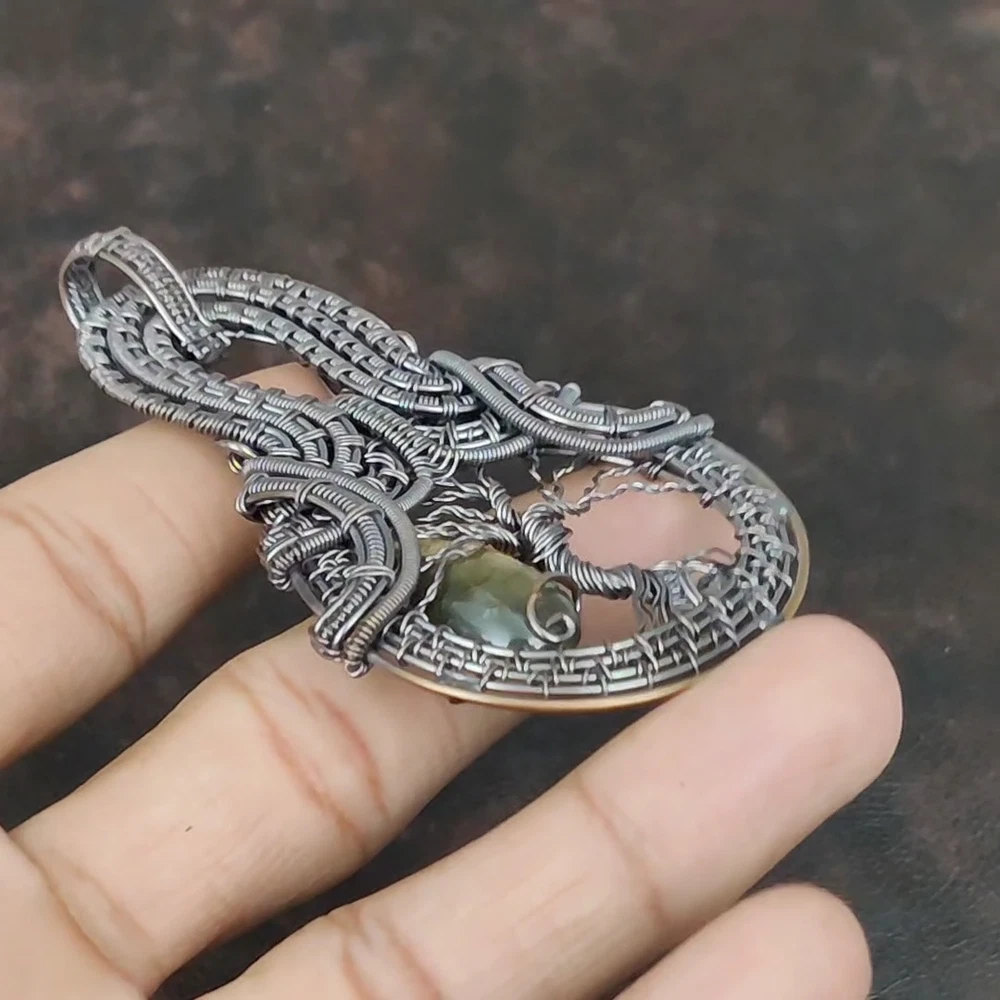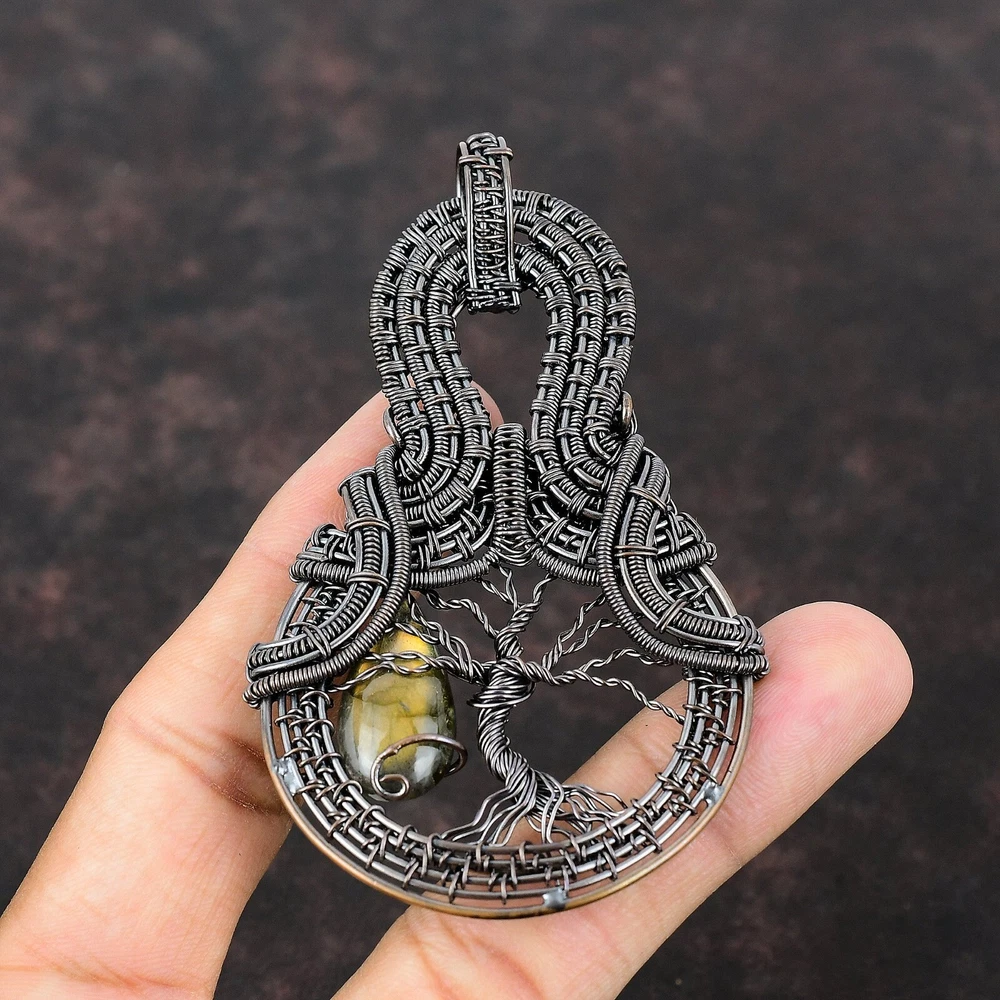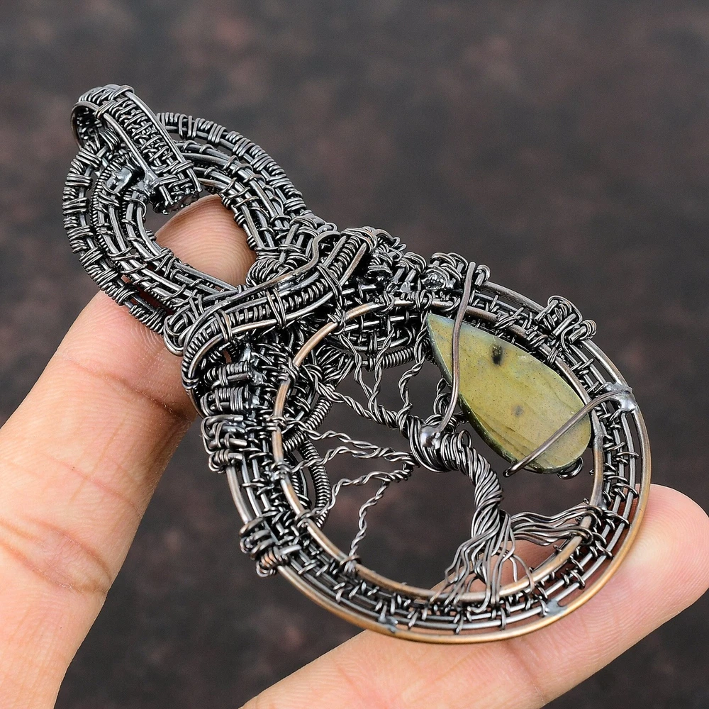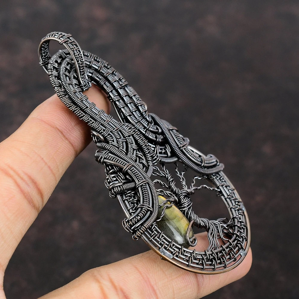 Note : Due to the natural formation of this gemstone. Slight variation in design and color are to be expected. Welcome to Silver Creation Handmade Pendant, Wire Wrapped Pendant, Wire Wrapped Jewelry, Copper Pendant, Copper Wire Pendant, Wrapped Jewelry, Wire Wrap Pendant, Wire Wrap Jewelry SKU : VFWP-375 Gemstone : Labradorite Stone Shape : Pear Metal Purity : Unknown Copper Length : 90 Millimetres Width : 55 Millimetres Copper has been used for jewelry making for thousands of years, dating back to ancient civilizations such as the Egyptians, Romans, and Aztecs. Copper was valued for its beauty, versatility, and durability, and was often used to make everything from jewelry and coins to cookware and tools. In addition to its historical significance, copper jewelry also offers several benefits. Copper is a natural conductor of heat and electricity, which makes it ideal for energy healing and therapeutic purposes. Wearing copper jewelry is believed to have various health benefits, such as improving circulation, reducing inflammation, and boosting the immune system. Some people also believe that copper jewelry has the ability to balance energy and improve mood. For Mother's Day Gift For Father's Day Gift For Promise For Valentine' Day For Halloween Party For Christmas Day Gift For New Year Party For Mom For Her If you can't find the information you need or need some advice for your design? Feel free to contact us. We are fast to reply :) All our work is made by hand with Love and Care in our workshop Thank you so much for visiting and hope you enjoy shopping with us Silvercreations is committed to delivering the best quality sterling silver jewelry to customers. As a handmade jewelry manufacturer, we offer an extensive selection of copper gemstone jewelry that showcases the brilliance of our craftsmanship. We are an experienced handmade jewelry supplier with expertise in embellishing gemstones to suit every style. We offer you the liberty to create your jewelry ensemble with sparkling, earthy, and pure gemstones. Our Talented artisans masterfully handcraft each piece of jewelry you see here. Our pieces are made with genuine gemstones.