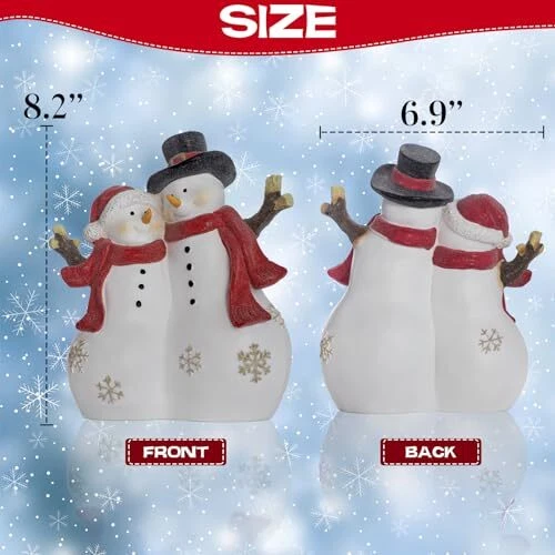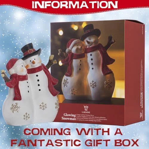 30 Days Return Policy Fast Delivery Trusted seller Christmas Decor Snowman Figurines Resin Lighted Indoor Ornaments Holiday Tree Festive Decorations Light Up New Year Gift Decoration for Table (Snowman Couple) Product Description The dimensions of the snowman couple are 6.9"W x 8.2"H, and they are powered by 2 AAA batteries (BATTERIES NOT INCLUDED). This is the perfect size to adorn your festive table centerpieces. Brighten up your living space with the Figurines Resin Lighted Sowman Couple - Ideal for enhancing your indoor Christmas or holiday decorations, these LED-lit Snowman figures will infuse your home with a festive spirit. Experience superior craftsmanship with our handcrafted snowman couple Sculpture, meticulously crafted from high-quality resin and adorned with hand-painted details. This durable indoor decoration is built to stand the test of time, bringing joy for years to come. Elevate your holiday decor with our Christmas Collectible Figurines, d to bring extra delight to your Christmas ambiance. The more, the merrier! Add them to your snowman couple decor for a joyous, fun-filled celebration with loved ones. Let's use this glowing decoration to create a winter holiday atmosp. Simply place the Glowing Snowman Couple on your tabletop, mantel, or stairway for an enchanting and magical touch. Shipping Returns Payment Shipping Shipping is FREE to all addresses other than APO/PO boxes in the lower 48 states. All our stock ships from US-based warehouses. Shipped via USPS or UPS (depending on location and package weight) Unless stated otherwise, all orders will ship within 24-72 hours of your payment being processed. Check our feedback to see the great reviews of FAST shipping we offer. Returns As our valued customer, we will do our best to make sure the product you receive arrives to you on time and as expected. If you are not satisfied with your purchase, please contact us within 30 days of receiving your order to process a return. Payment We currently accept payment via eBay managed payments only. Once payment is cleared, we will dispatch your shipment within 1-3 business days. Please refer to the "Shipping" tab for more information regarding shipping speed to your destination.