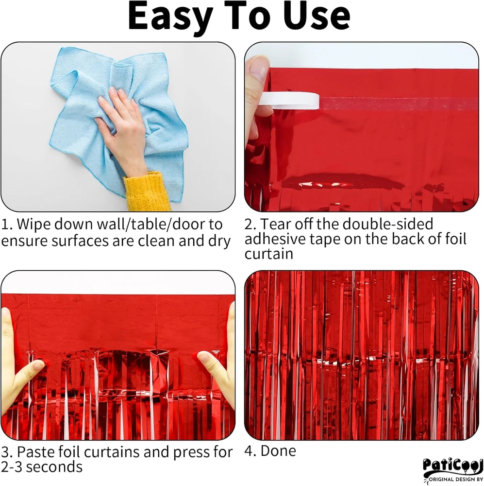 100% Pet ππΞΌπ¦ πππππππ | ππππ ππππππ - This red streamers is made of 23ΞΌm plastic film, not easy to fall apart. But due to the inherent characteristics of the material, it is still easy to tear even if we use thicker material, so you need to be very careful when using it. π.π π± π.π π π | π ππππ - This red metallic streamers are long enough to decorate doors or walls, you can freely adjust the length, width and thickness of them according to the desired scene. Paste them side by side for a wider range of decoration, stack 2 or more to achieve a thicker and denser effect. ππππ ππ πππ - Just peel off the double sided adhesive sticker on the back of the foil fringe curtains and stick it to a smooth surface, press it with your hands for about 5 seconds so it stays longer. It is not recommended to use it on painted walls or uneven surfaces. πππ ππππππππ ππππππππ - Perfect for birthday, carnival, casino, graduation, cherry, Valentines Day, Christmas, hollywood red carpet party decorations, and any other events you want to decorate. πππ & πππππ - This red backdrop curtains can be used with balloons, banners, LED light and various photo props, or use it with other tinsel backdrop of different colors to achieve the color combination that you desired! Product description PatiCool Thicken 23ΞΌm 3.2 x 8.2 FT Foil Fringe Curtain Multiple color options The video showcases the product in use. The video guides you through product setup. The video compares multiple products. The video shows the product being unpacked. Thicken 23ΞΌm 3.2 x 8.2 FT Party Streamers Merchant Video Perfect for all kinds of themed party decorations The video showcases the product in use. The video guides you through product setup. The video compares multiple products. The video shows the product being unpacked. Thicken 23ΞΌm 3.2 x 8.2 FT Party Streamers Merchant Video 1 Blue 2 Silver 3 Purple 4 Gold 5 Black 1 Gradient Rainbow 2 Pastel Rainbow 3 Rainbow 4 Red White and Blue 1 Pink 2 Rose Gold 3 Hot Pink 4 Green 5 Red Goes Well with Add to Cart Add to Cart Add to Cart Add to Cart Add to Cart Add to Cart Add to Cart Customer Reviews 4.6 out of 5 stars 279 4.7 out of 5 stars 429 4.3 out of 5 stars 913 4.3 out of 5 stars 302 4.6 out of 5 stars 265 4.6 out of 5 stars 168 4.9 out of 5 stars 36 Price $14.99 $ 14 . 99 $6.99 $ 6 . 99 $3.99 $ 3 . 99 $5.86 $ 5 . 86 $6.99 $ 6 . 99 $9.99 $ 9 . 99 $14.99 $ 14 . 99 Color Options 14 Colors 30 Colors 9 Colors 10 Colors 5 Colors Black and Gold / Material 23ΞΌm THICKEN PET Latex Foil Foil Cardstock Cardstock + Paper Paper + PVC Size 3.2 x 8.2 FT 12 INCH 40 INCH 16 INCH / / / Applications Party Decorations Party Decorations Party Decorations Birthday Decorations Birthday Decorations Birthday Decorations Birthday Decorations Easy To Use β β β β β β β Halloween Party Decorations Halloween Caution Tape 3 in x 88.6 ft Indoor / Outdoor tear resistant, high visibility, waterproof, UV resistant Happy Birthday Banner Pre-Strung Real Glitter Halloween / Gothic Style Happy Halloween Decor Kit Pre-Strung Real Glitter Halloween Balloons 12 inch Orange / Black / Purple / Red Halloween Streamers 23ΞΌm THICKEN 3.2 x 8.2 FT