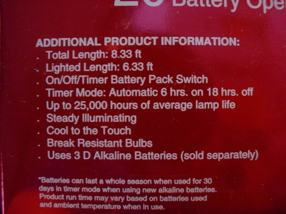 This Christmas Enchanted Forest LED Light 20 White Battery uses three "D" batteries, not included. The last set sold has no replacement bulbs. Multiple winning auctions may be shipping together. If you are bidding on and win multiple auctions from me, please wait for the invoice so I can adjust the shipping cost. As a seller, my policy is to leave feedback once the buyer receives an item and leaves feedback for me. Feedback also lets me know that you received your item. Please remember feedback benefits the buyer as much as the seller.