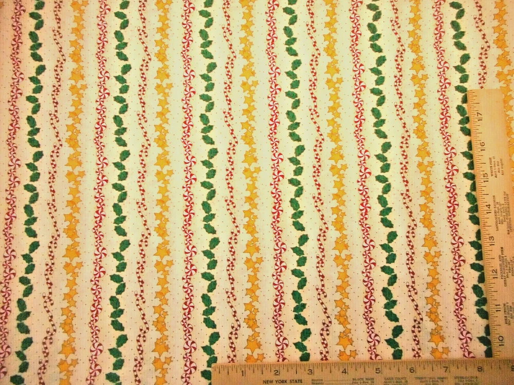 This is a very nice fabric that is 100% cotton. This is a premium quilting cotton by Fabri-Quilt called Season's Greetings. It has stripes of yellow/gold stars, green holly, red & white candy canes & red & white round candy all outlined with metallic gold on a creamy beige background that has tiny metallic gold dots in it.. READ: Because computer monitors show colors and shades differently, the fabric colors can vary from the photos. If you have any questions regarding this, please contact me before p urchasing the item. I have been a quilter for 30 years and am an accomplished seamstress & would be happy to answer any questions you might have. This is for a 1 1/4 Yard of Fabric. If you have a problem with anything you purchase from me, please contact me before leaving neutral or negative feedback and I will work it out with you. Payment is due within 48 hours. If payment isn't received within 5 days, it will automatically go to Ebay's resolution center for non-payment. INSTRUCTIONS FOR COMBINED SHIPPING: I Do combine shipping. You must put your items into your shopping cart and request an invoice from me using the request total button before completing the payment process. IF YOU'RE UNABLE TO COMBINE YOUR SHIPPING, PLEASE CONTACT ME. Payment is due upon receipt of your invoice. Thank you for looking and God bless you and your famil IF THERE IS A PROBLEM WITH ANY PURCHASE, PLEASE CONTACT ME, THE SELLER, VIA EBAY'S MESSAGING SYSTEM PRIOR TO OPENING A CASE--OPENING A CASE, EVEN IF RESOLVED SMOOTHLY, CAN HURT THE SELLER'S RATINGS. THANK YOU