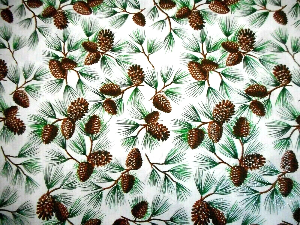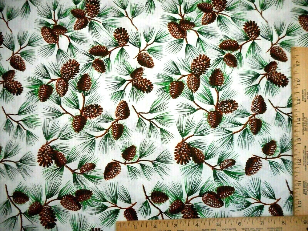 This is a very nice fabric that is 100% cotton. This is a premium quilting cotton by David Textiles. It has branches with brown pine cones & green pine with metallic silver glitter on a white background. READ: Because computer monitors show colors and shades differently, the fabric colors can vary from the photos. If you have any questions regarding this, please contact me before p urchasing the item. I have been a quilter for 30 years and am an accomplished seamstress & would be happy to answer any questions you might have. This is for a 1 3/4 Yard of Fabric. If you have a problem with anything you purchase from me, please contact me before leaving neutral or negative feedback and I will work it out with you. Payment is due within 48 hours. If payment isn't received within 5 days, it will automatically go to Ebay's resolution center for non-payment. INSTRUCTIONS FOR COMBINED SHIPPING: I Do combine shipping. You must put your items into your shopping cart and request an invoice from me using the request total button before completing the payment process. IF YOU'RE UNABLE TO COMBINE YOUR SHIPPING, PLEASE CONTACT ME. Payment is due upon receipt of your invoice. Thank you for looking and God bless you and your family. IF THERE IS A PROBLEM WITH ANY PURCHASE, PLEASE CONTACT ME, THE SELLER, VIA EBAY'S MESSAGING SYSTEM PRIOR TO OPENING A CASE--OPENING A CASE, EVEN IF RESOLVED SMOOTHLY, CAN HURT THE SELLER'S RATINGS. THANK YOU