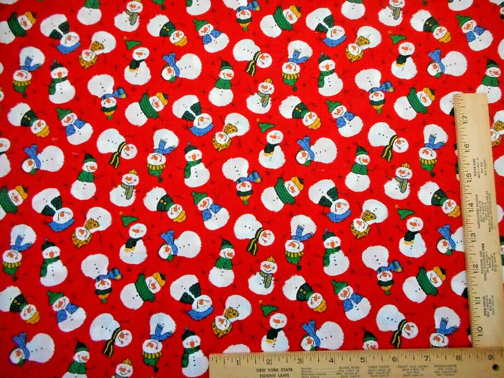 This is a very nice fabric that is 100% cotton. This fabric is out of print. It has smiling snowmen wearing blue, green & gold hats, scarves & sweaters on a red background. NOTE: THE AREAS WHERE IT LOOKS LIKE THERE ARE WHITE SPOT IS ONLY LINT ON THE FABRIC. READ: Because computer monitors show colors and shades differently, the fabric colors can vary from the photos. If you have any questions regarding this, please contact me before p urchasing the item. I have been a quilter for 30 years and am an accomplished seamstress & would be happy to answer any questions you might have. This is for a 1 Yard of Fabric. If you have a problem with anything you purchase from me, please contact me before leaving neutral or negative feedback and I will work it out with you. Payment is due within 48 hours. If payment isn't received within 5 days, it will automatically go to Ebay's resolution center for non-payment. INSTRUCTIONS FOR COMBINED SHIPPING: I Do combine shipping. You must put your items into your shopping cart and request an invoice from me using the request total button before completing the payment process. IF YOU'RE UNABLE TO COMBINE YOUR SHIPPING, PLEASE CONTACT ME. Payment is due upon receipt of your invoice. Thank you for looking and God bless you and your family. IF THERE IS A PROBLEM WITH ANY PURCHASE, PLEASE CONTACT ME, THE SELLER, VIA EBAY'S MESSAGING SYSTEM PRIOR TO OPENING A CASE--OPENING A CASE, EVEN IF RESOLVED SMOOTHLY, CAN HURT THE SELLER'S RATINGS. THANK YOU