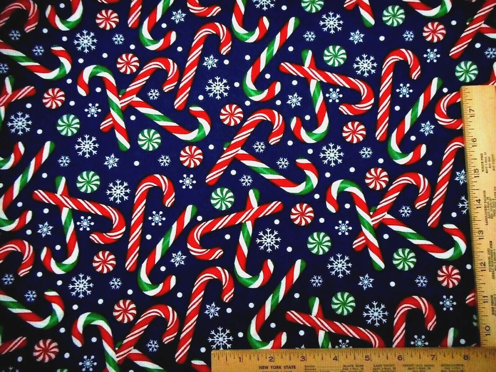 Christmas Fabric By 1/2 Yard Candy Cane Peppermint Candy Snow Dk Blue Cotton #39