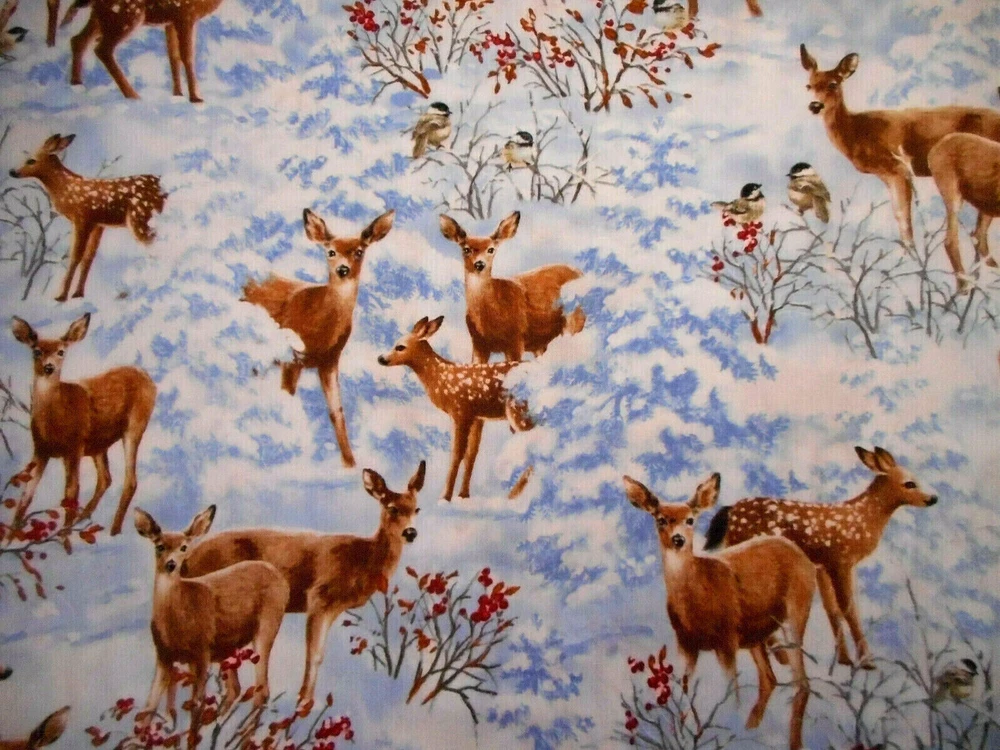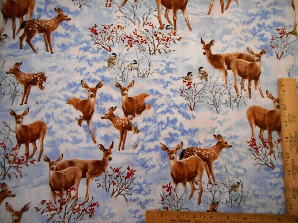 This is a very nice fabric that is 100% cotton. This a premium quilting cotton by Timeless Treasures called Nature's Holiday. It has deer & fawn in light blue & white snow with some plants with red on them & a few birds. READ: Because computer monitors show colors and shades differently, the fabric colors can vary from the photos. If you have any questions regarding this, please contact me before p urchasing the item. I have been a quilter for 30 years and am an accomplished seamstress & would be happy to answer any questions you might have. This is for a 1 Half-Yard (1/2) of Fabric. If you purchase more than 1 Half-Yard, I will give you one continuous cut. If you have a problem with anything you purchase from me, please contact me before leaving neutral or negative feedback and I will work it out with you. Payment is due within 48 hours. If payment isn't received within 5 days, it will automatically go to Ebay's resolution center for non-payment. INSTRUCTIONS FOR COMBINED SHIPPING: I Do combine shipping. You must put your items into your shopping cart and request an invoice from me using the request total button before completing the payment process. IF YOU'RE UNABLE TO COMBINE YOUR SHIPPING, PLEASE CONTACT ME. Payment is due upon receipt of your invoice. Thank you for looking and God bless you and your family. IF THERE IS A PROBLEM WITH ANY PURCHASE, PLEASE CONTACT ME, THE SELLER, VIA EBAY'S MESSAGING SYSTEM PRIOR TO OPENING A CASE--OPENING A CASE, EVEN IF RESOLVED SMOOTHLY, CAN HURT THE SELLER'S RATINGS. THANK YOU