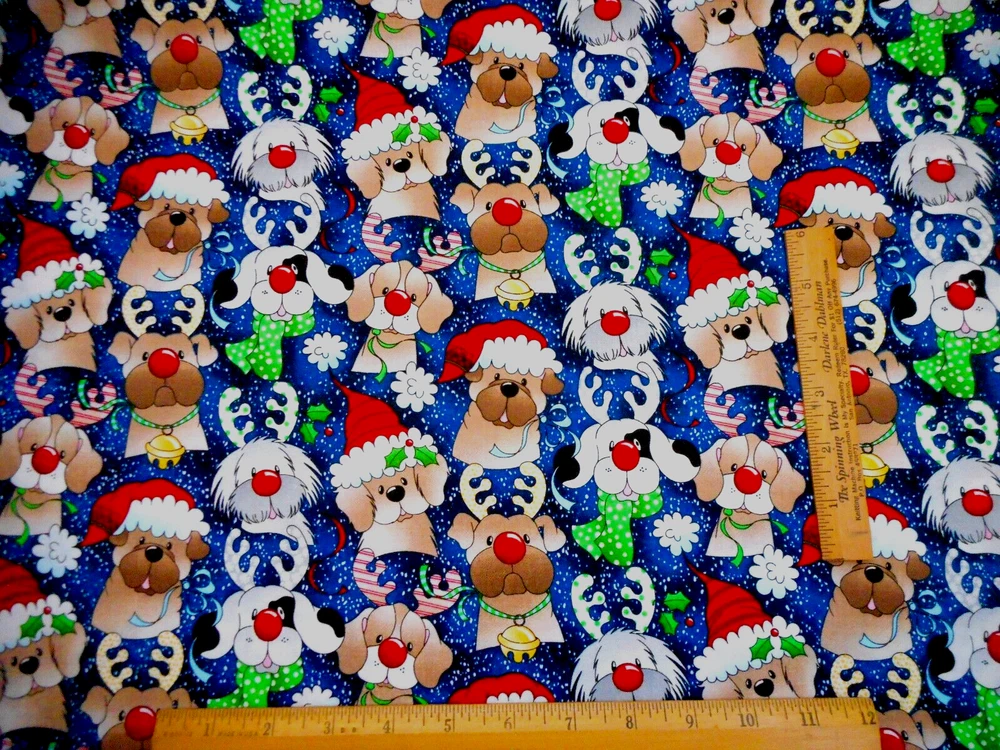 This is a very nice fabric that is 100% cotton. This is a premium quilting cotton by Fabric Traditions. It has cute dogs in Christmas hats & antlers with tiny white snow dots on mottled dark blue background. READ: Because computer monitors show colors and shades differently, the fabric colors can vary from the photos. If you have any questions regarding this, please contact me before p urchasing the item. I have been a quilter for 30 years and am an accomplished seamstress & would be happy to answer any questions you might have. This is for a 1 Half-Yard of Fabric. If you purchase more than 1 Half-Yard, I will give you one continuous cut. If you have a problem with anything you purchase from me, please contact me before leaving neutral or negative feedback and I will work it out with you. Payment is due within 48 hours. If payment isn't received within 5 days, it will automatically go to Ebay's resolution center for non-payment. INSTRUCTIONS FOR COMBINED SHIPPING: I Do combine shipping. You must put your items into your shopping cart and request an invoice from me using the request total button before completing the payment process. IF YOU'RE UNABLE TO COMBINE YOUR SHIPPING, PLEASE CONTACT ME. Payment is due upon receipt of your invoice. Thank you for looking and God bless you and your family. IF THERE IS A PROBLEM WITH ANY PURCHASE, PLEASE CONTACT ME, THE SELLER, VIA EBAY'S MESSAGING SYSTEM PRIOR TO OPENING A CASE--OPENING A CASE, EVEN IF RESOLVED SMOOTHLY, CAN HURT THE SELLER'S RATINGS. THANK YOU